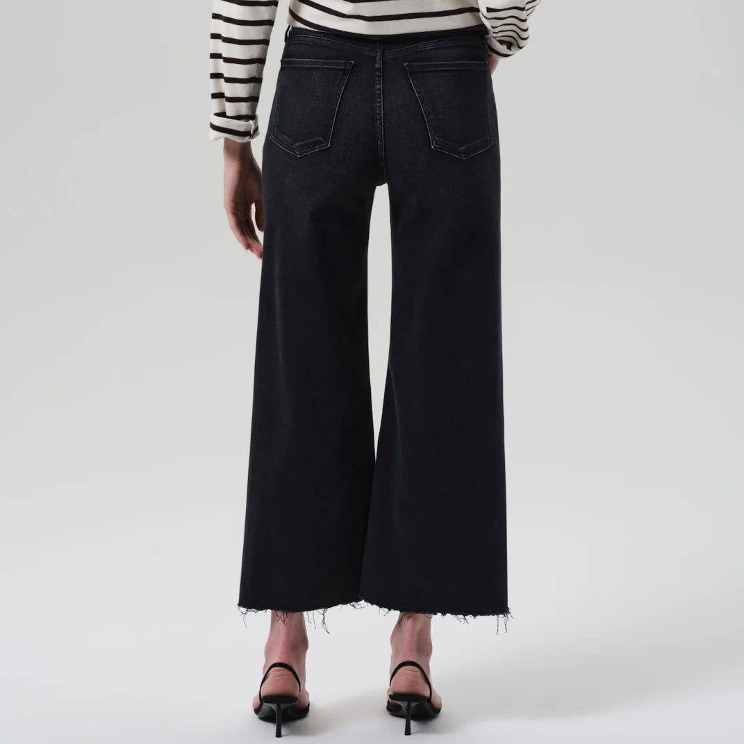 Citizens of Humanity Lyra Jean in Medallion. The Lyra is a vintage-inspired wide leg that sits high on the waist with a relaxed top block and cropped inseam for a voluminous, modern shape. Crafted from soft stretch denim, Medallion is a washed-out black with marbling and whiskering for a naturally worn-in look—perfect with tonal layers or crisp white shirting.