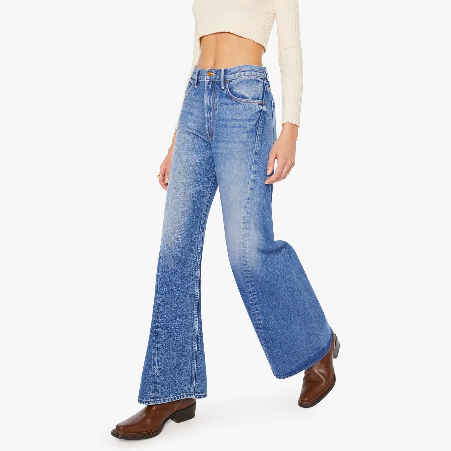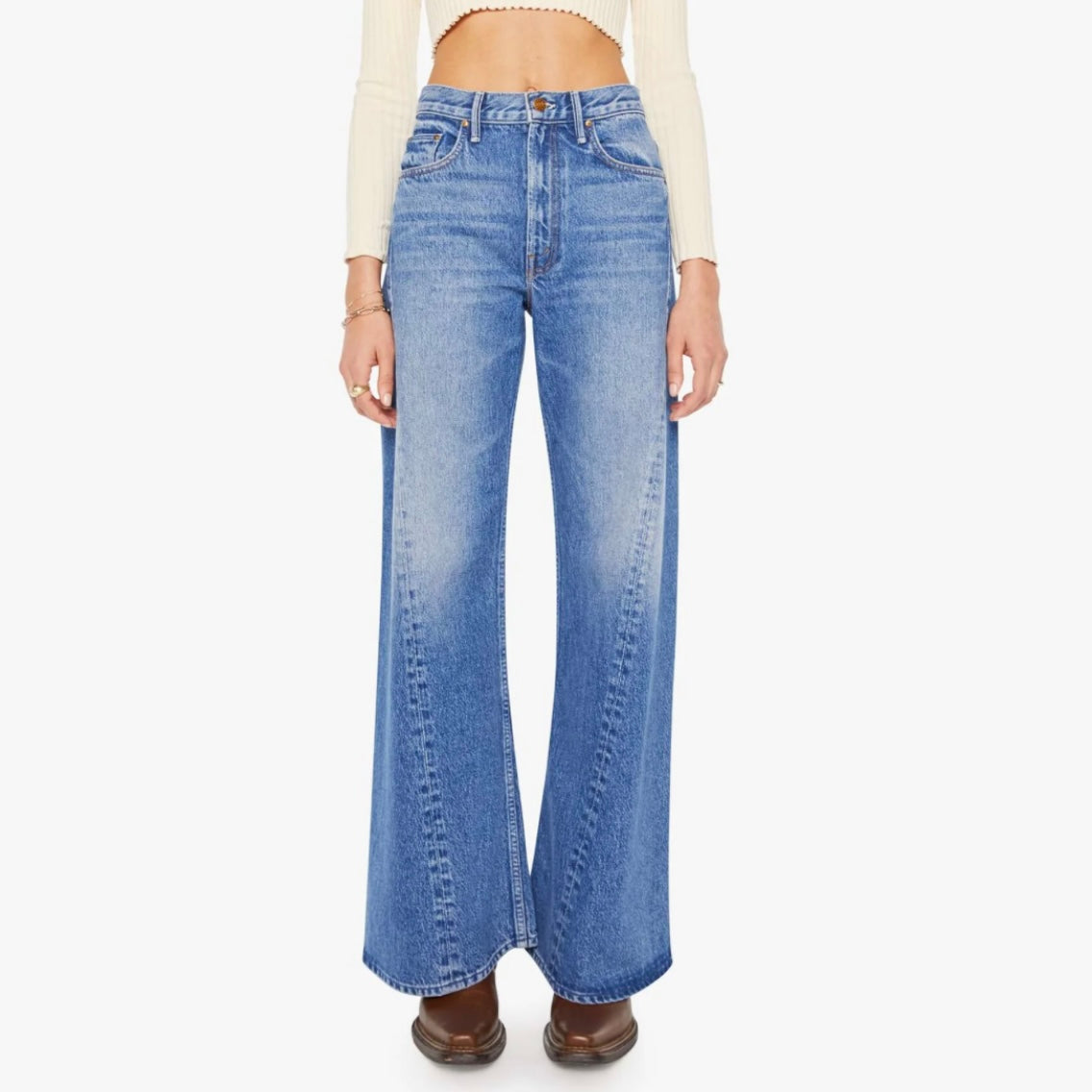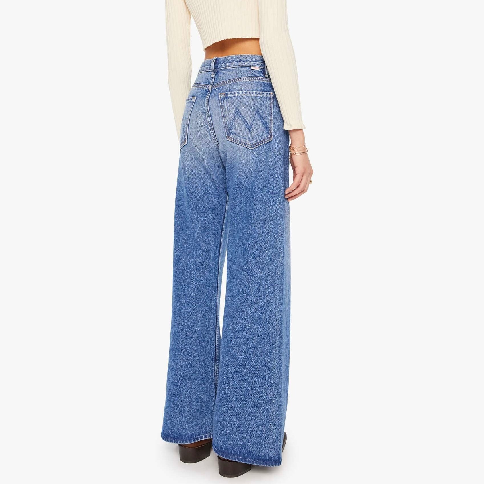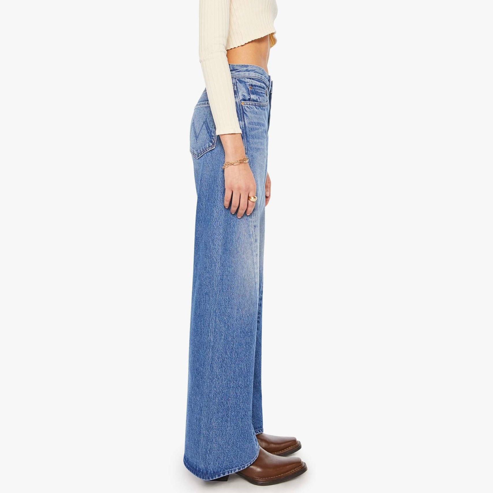 Mother Denim Lemon Twist Sneak in Rolling In The Dough. Wide leg jeans from SNACKS!, a collection of unconstrained silhouettes leaning into exaggerated shapes and extreme proportions. Experimental and non-era specific. For everyone, or not. These super high-waisted jeans have a loose wide leg with a curved outer seam and a long 33.5-inch inseam with a clean hem. Made from a rigid recycled cotton blend, Rolling In The Dough is a mid-blue with a pretzel-detailed button and candy-inspired interior rivets. Would you like a treat?