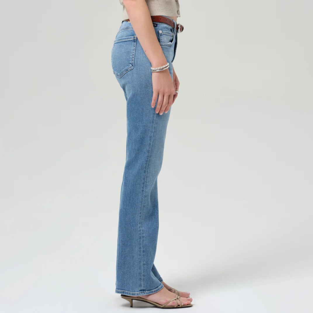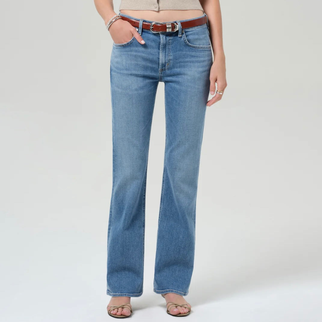 Citizens of Humanity Genova Low Rise Bootcut Jeans in Stella. The Genova is a low-slung bootcut crafted from our signature denim, blended with cashmere for an exceptionally soft hand. Sitting naturally on the hips, the silhouette extends into a full-length bootcut that elongates and refines. Finished in a light-to-medium indigo wash, it’s an effortlessly versatile piece that moves with ease from day to evening.