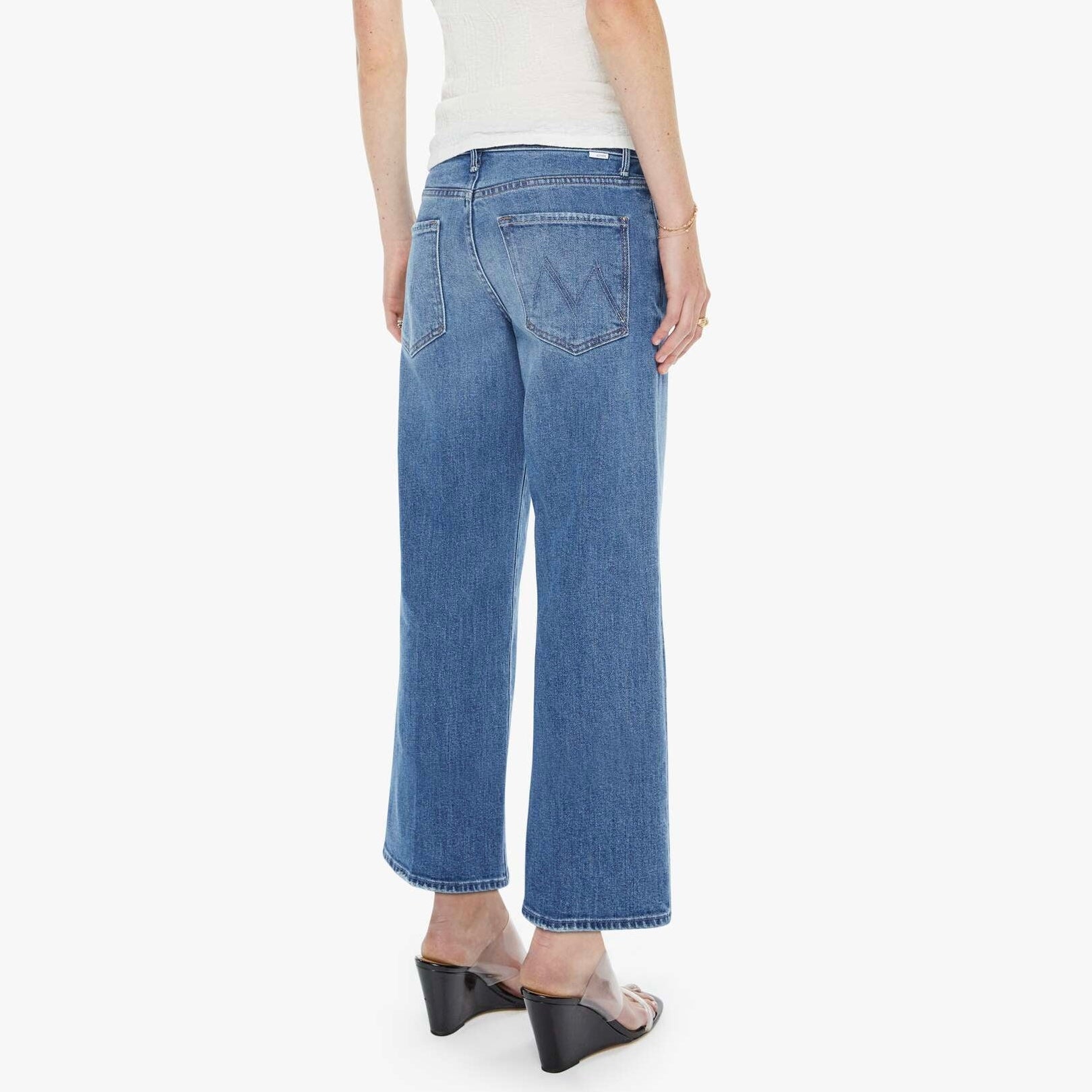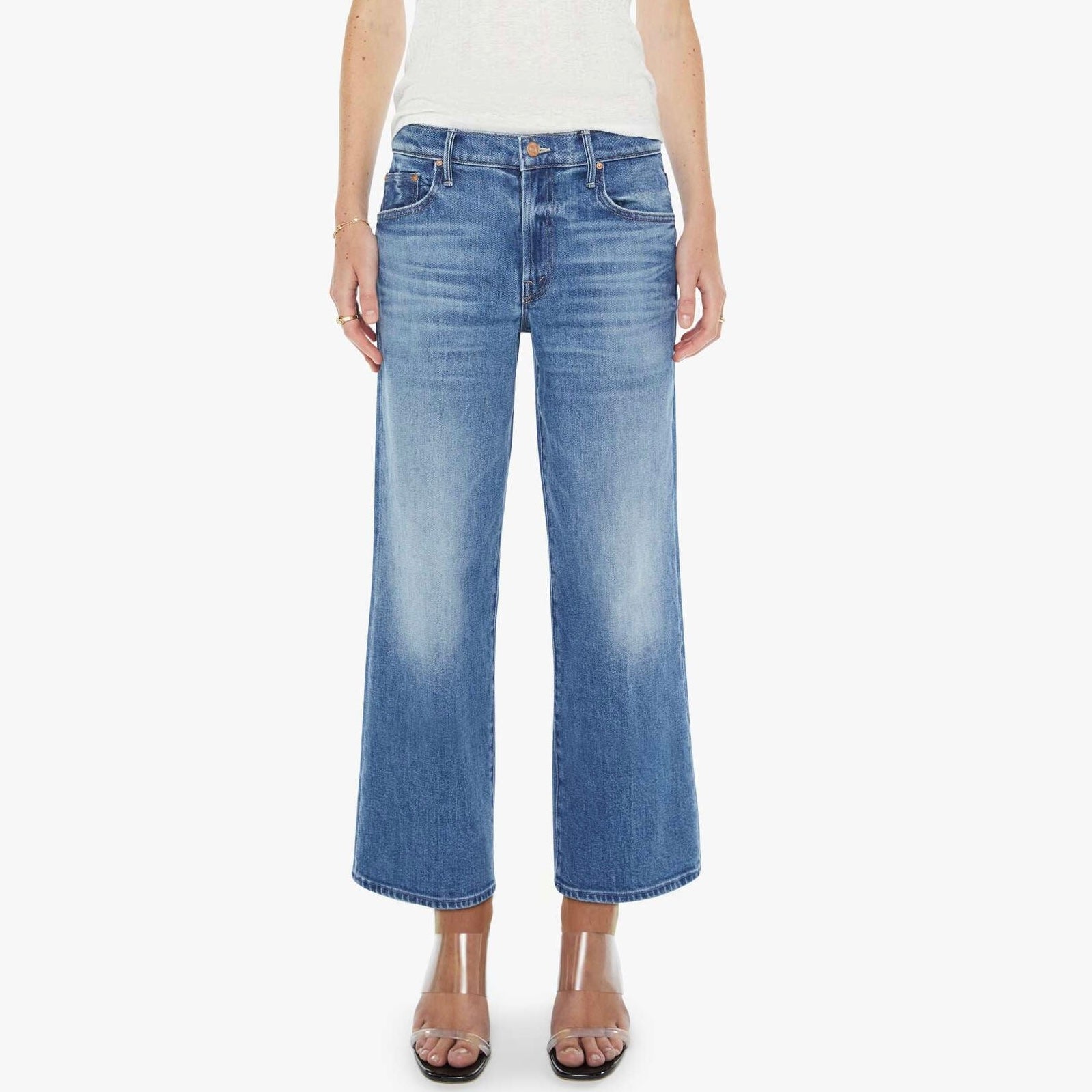 Mother Mid Rise Maven Ankle in All Your Eggs in One Basket. All in. Mid-rise jeans with a loose fit, wide leg, zip fly and ankle-length inseam with a clean hem. Made from stretch denim, All Your Eggs In One Basket is a mid blue with whiskering and fading at the knees.