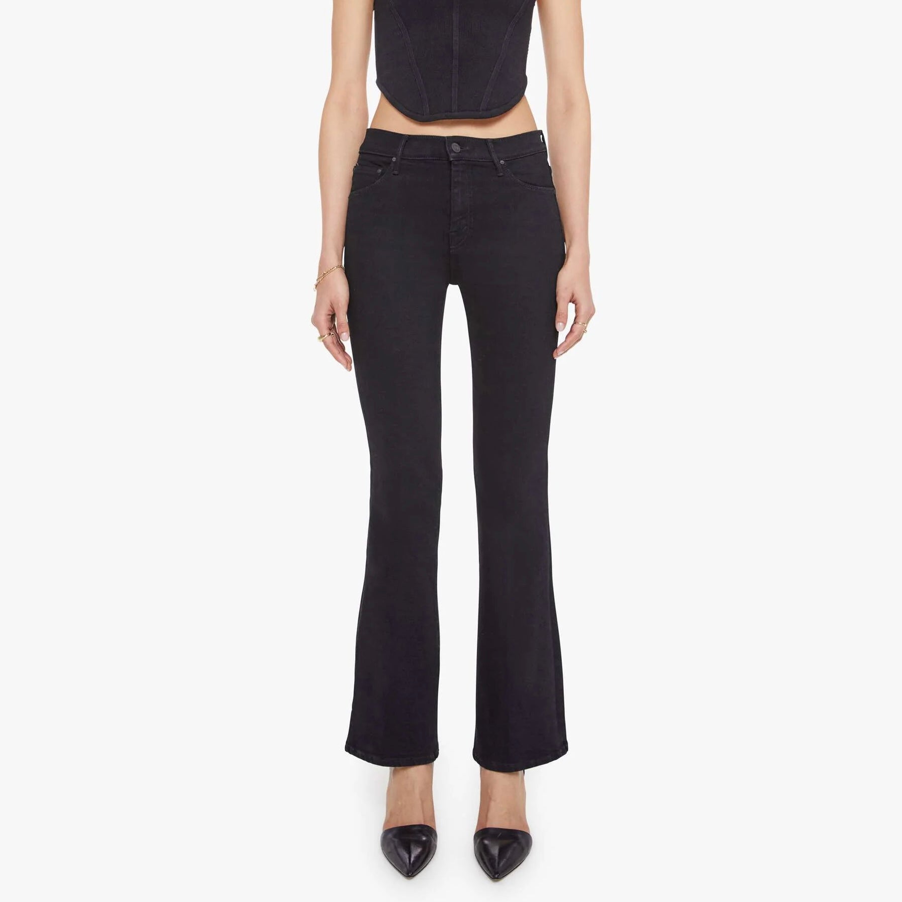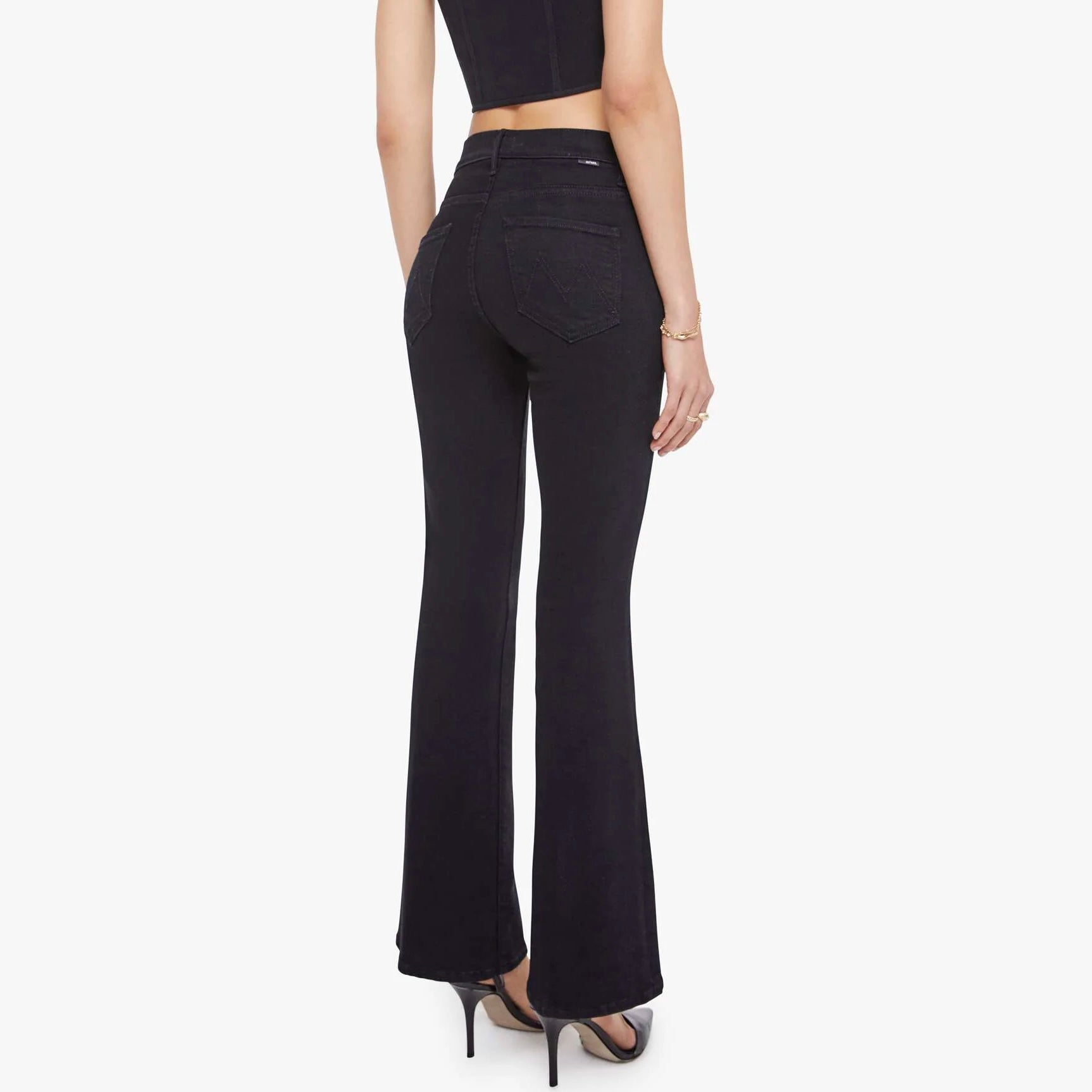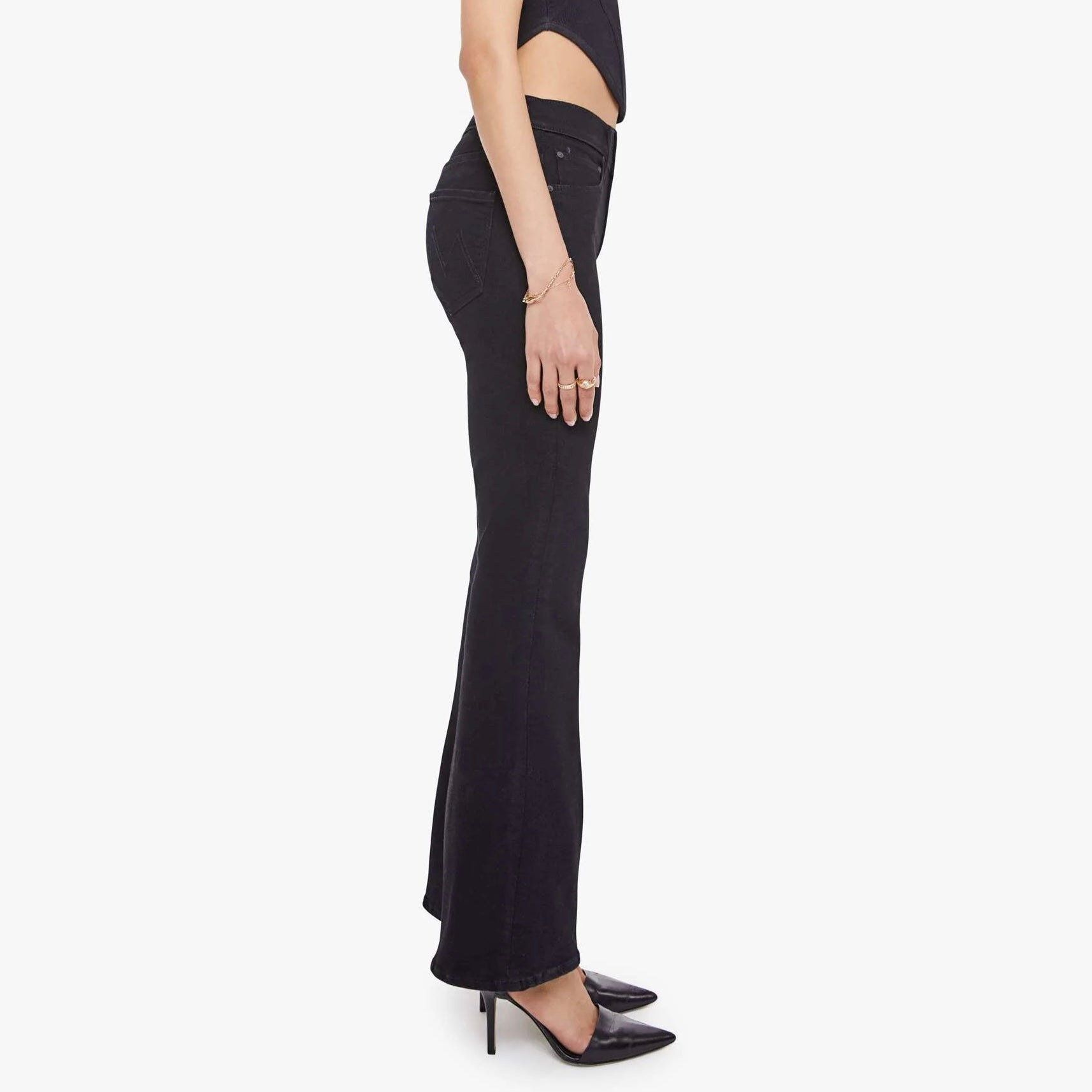 Mother The Weekender in Nighty Night. Sweet dreams. This cult-favorite flare jean has a mid rise with a 31-inch inseam and a clean hem. Cut from denim with a touch of stretch, Nighty Night is a dark black with tonal hardware.