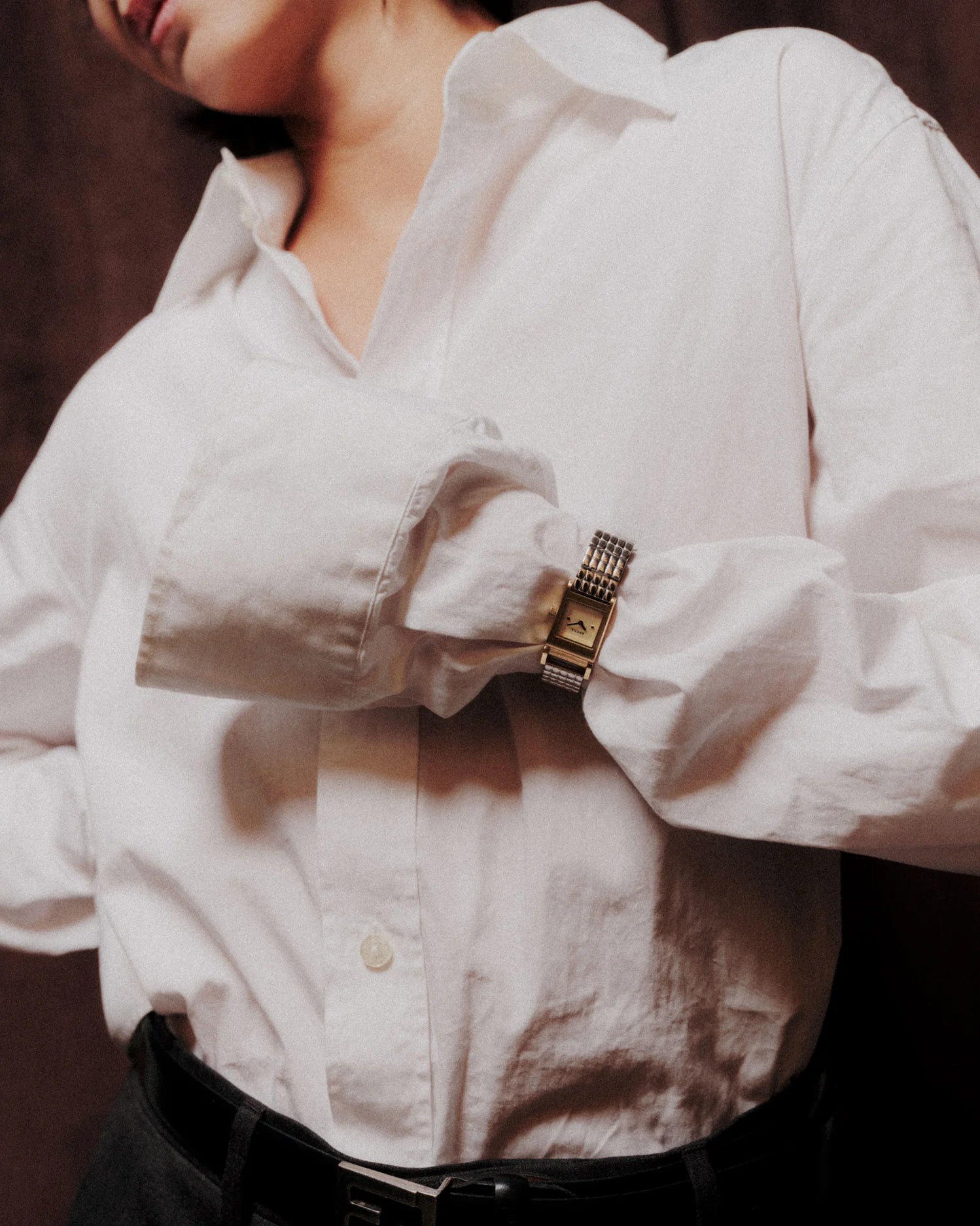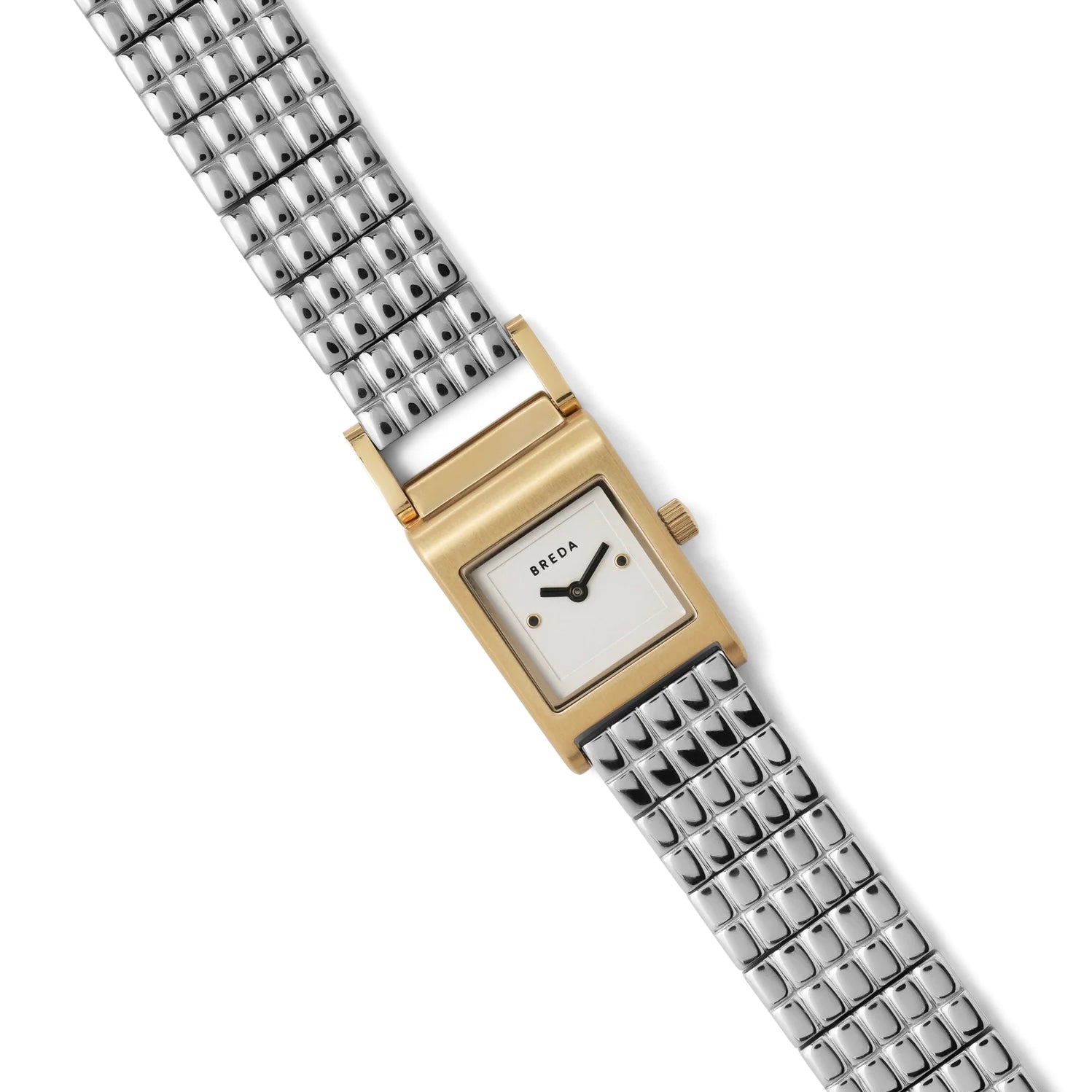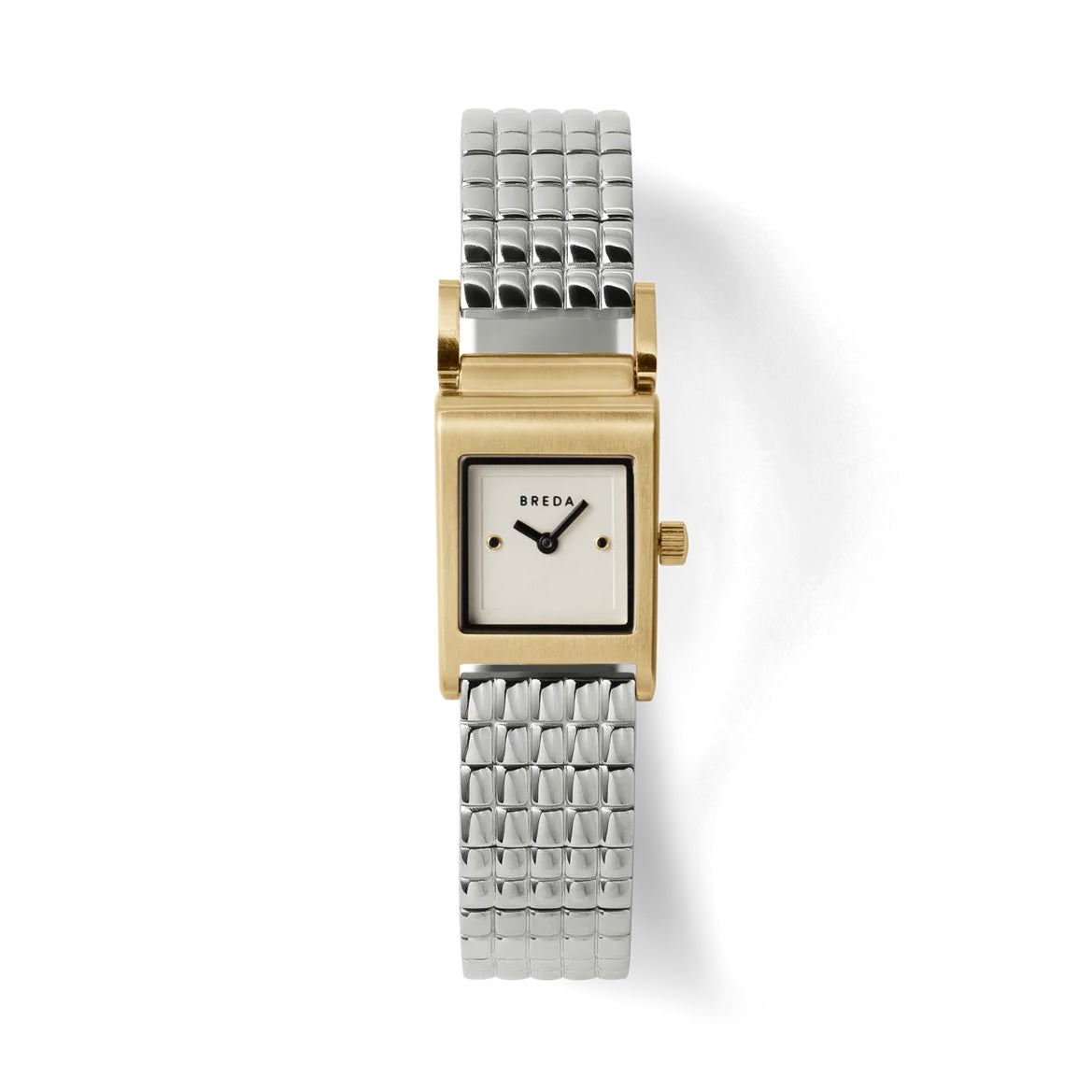 Breda Revel Watch in Gold/Silver/Ivory. Embracing moments of resiliency, the Revel exists as a reminder of power and personality. Carrying a petite 18mm squared case and 14mm bracelet this timepiece presents a delicate buckle feature and fastens with a jewelry clasp.