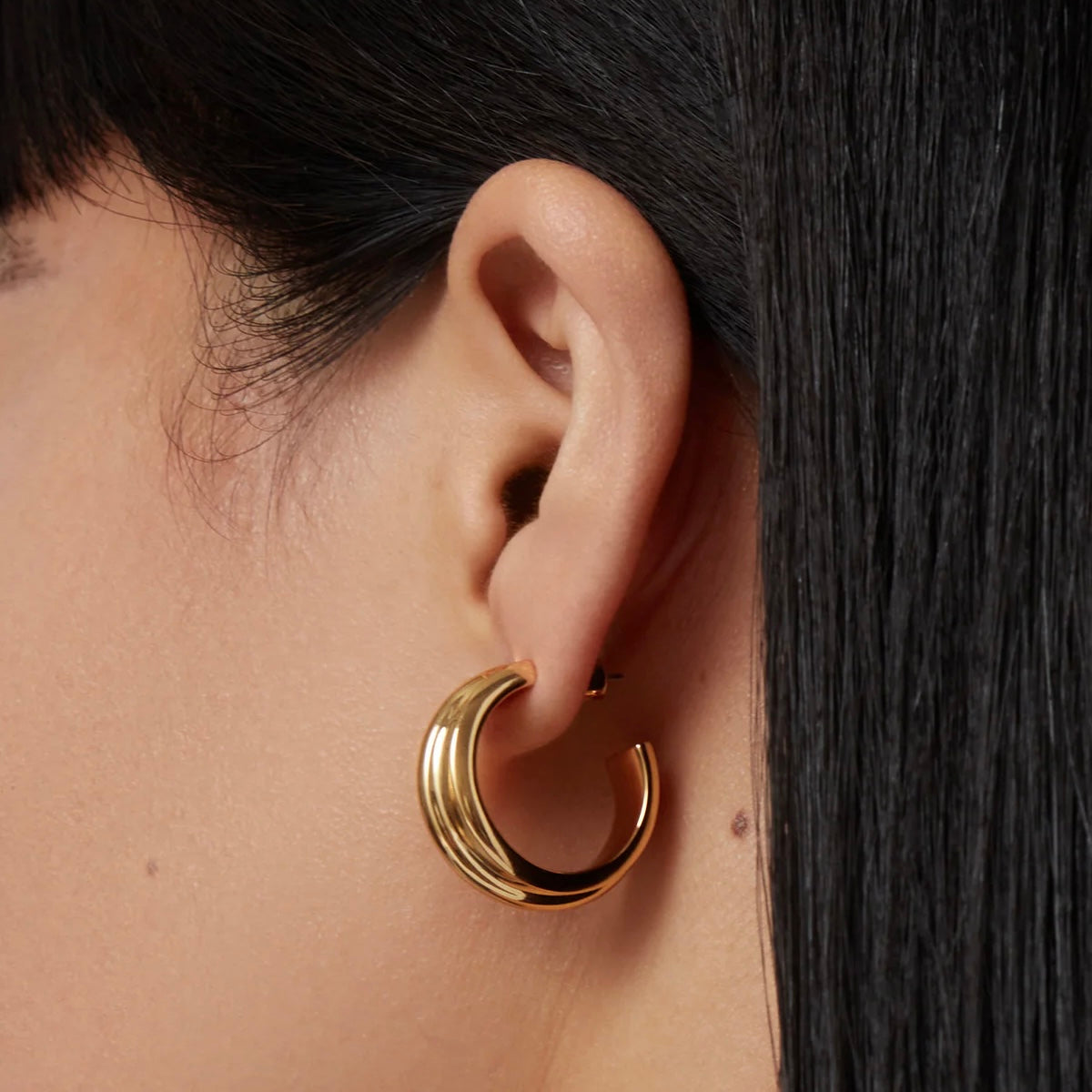 Jenny Bird Lennon Hoops in Gold. These gold hoop earrings boast deep contours. They are paired with Flat Disc Earring Backs for extra comfort. Finished in high-polish 14k gold.