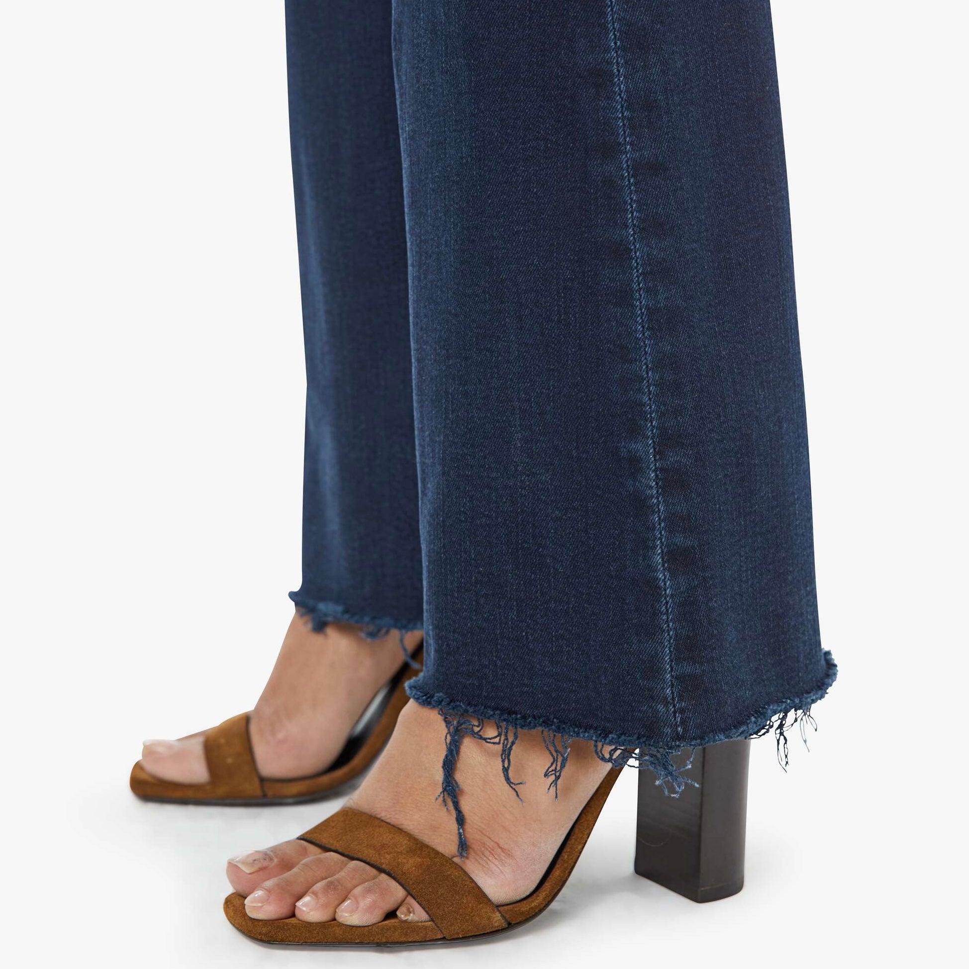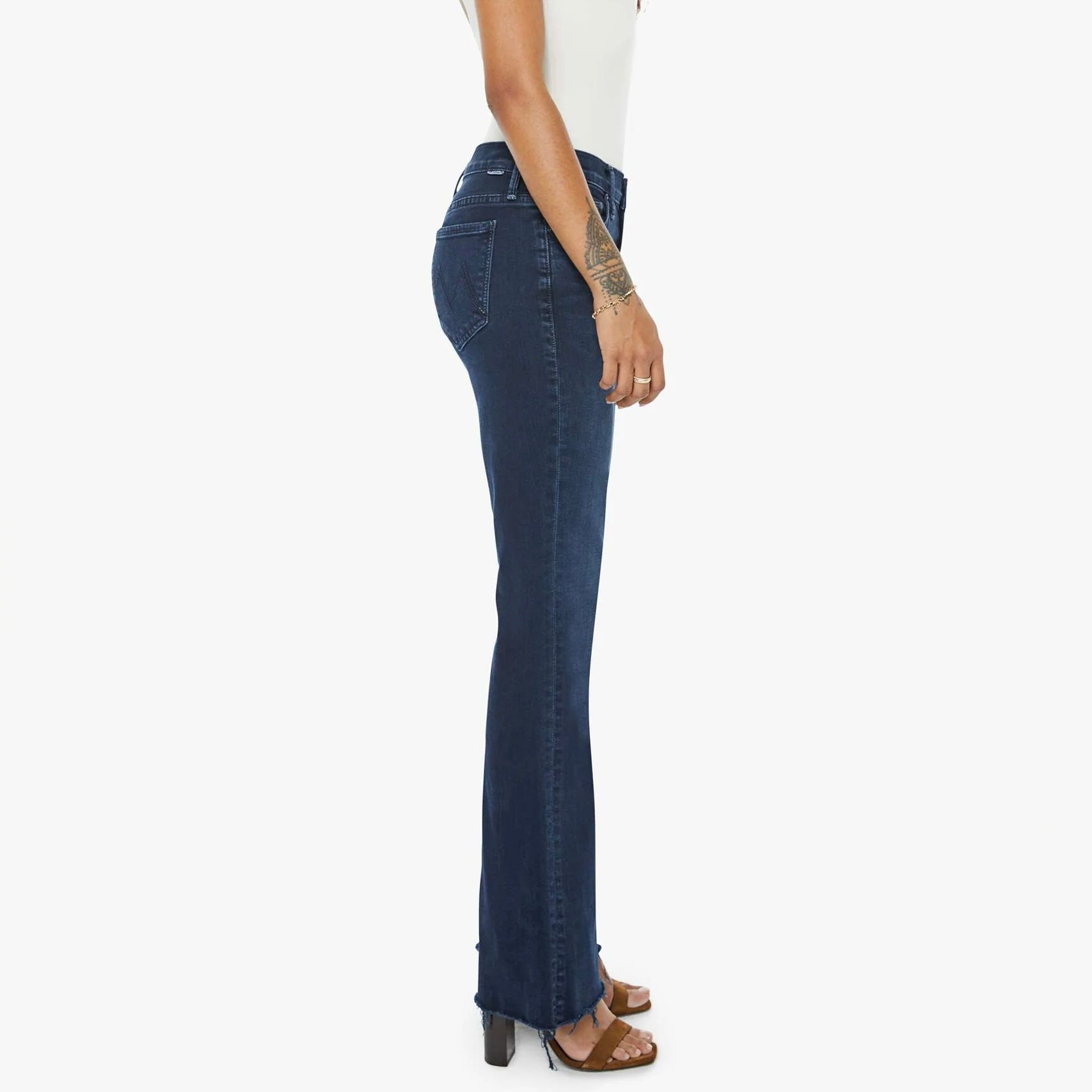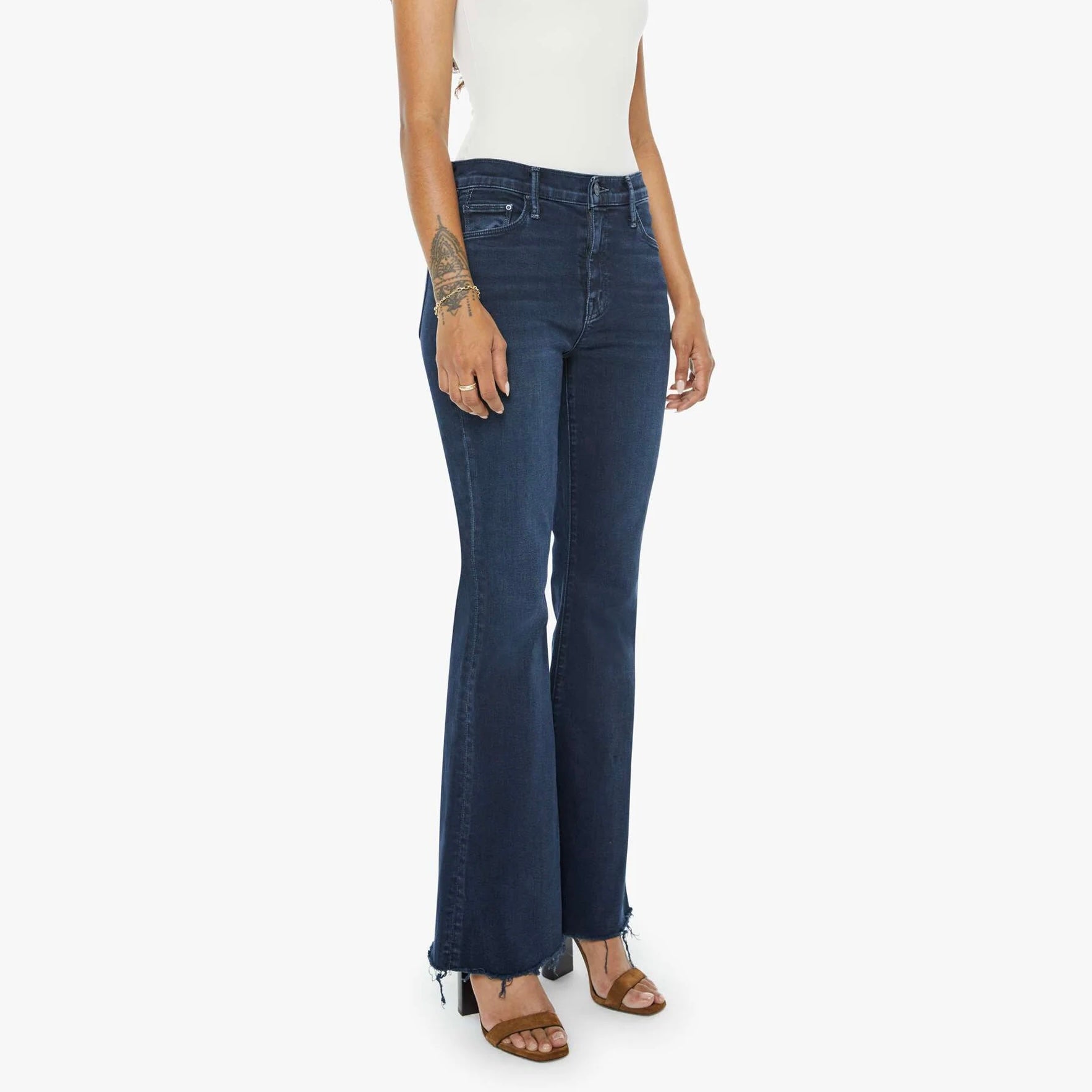 Our most popular mid-rise flare has a 29-inch inseam with a frayed hem. Cut from denim with a touch of stretch, Chip On My Shoulder is a dark blue wash with super subtle fading and whiskering.