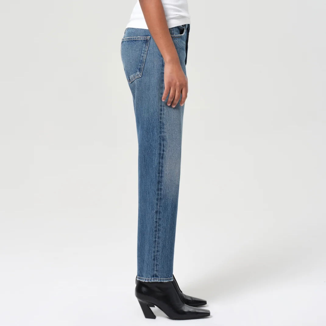 AGoldE 90’s Mid Rise Straight in Bounty. A timeless, relaxed silhouette in medium vintage indigo with subtle fading, marbling, and whiskering details. This mid-rise jean sits comfortably at the waist with a loose fit through the thigh, flowing into a straight leg. Made from rigid, non-stretch 100% regenerative cotton denim.