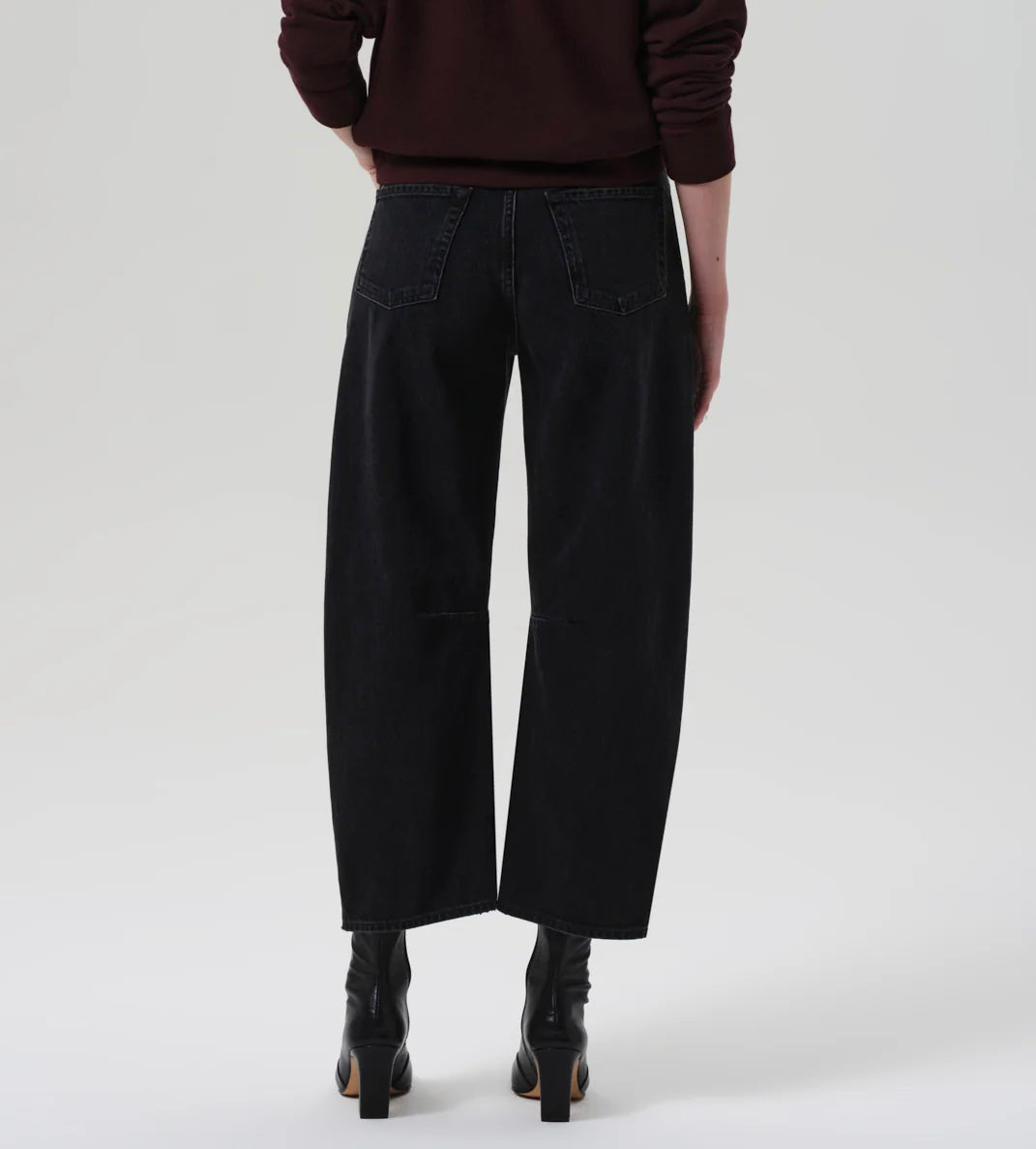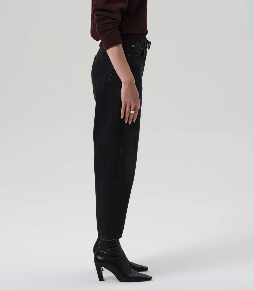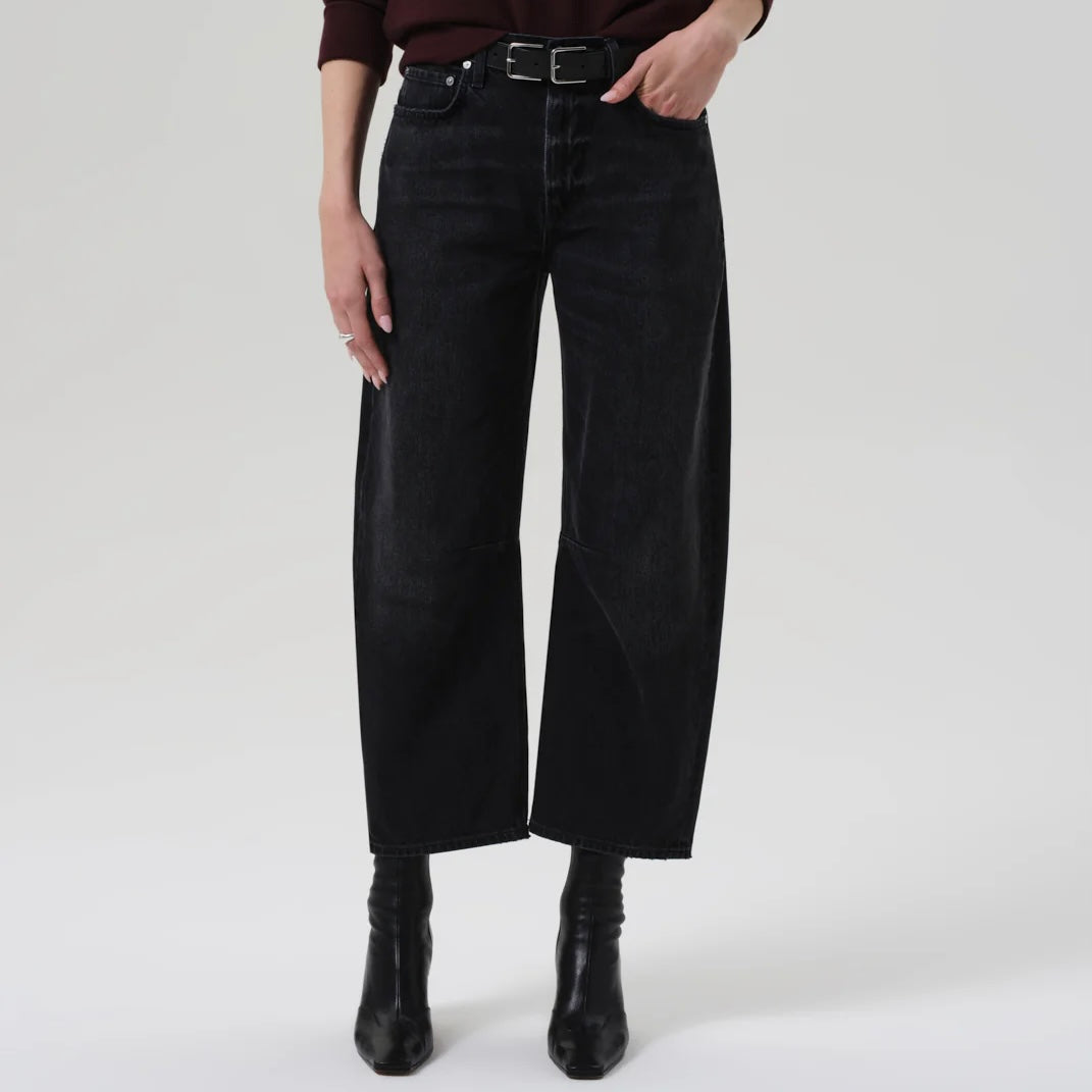 Citizens of Humanity Miro Jean in Raine. The ‘Miro’ is a subtle take on the barrel silhouette, cut with a relaxed taper and high rise for a modern yet easy fit. Crafted from rigid regenerative cotton with a soft, broken-in feel, the washed black denim features nuanced fading and marbling for a worn-in look. A versatile option that works with anything from sharp shirting to laid-back layers—finished with a clean ankle-length hem to suit any shoe.