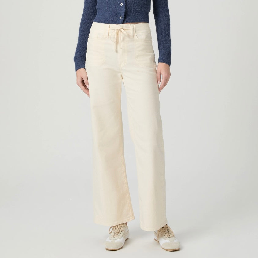 Paige Ari Wide Leg Pant in Quartz Sand. Ari is our modern high rise, wide leg weekender pant with a lightweight, relaxed fit and an ankle-length inseam. Crafted from super soft denim, this pair comes in an off-white wash with utility pockets and a waistband tie.