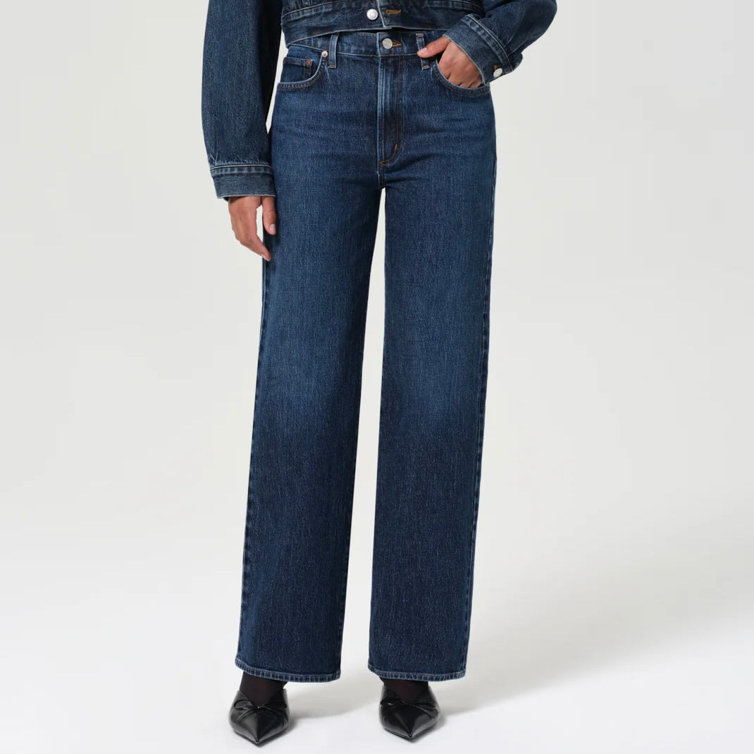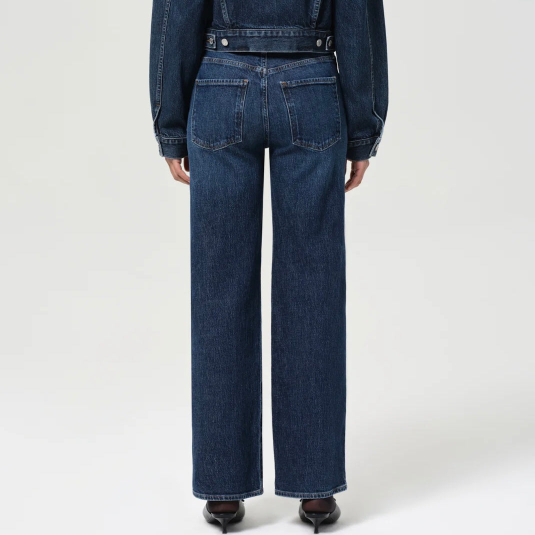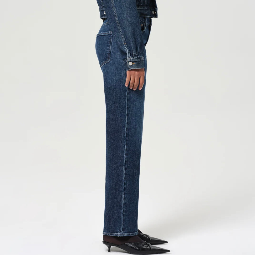 AGoldE Harper Straight Jean in Echo. The Harper is crafted from recycled cotton with just the right amount of stretch for comfort. Featuring a relaxed mid-rise fit, it has a flattering square top block and a straight leg. Made in dark vintage indigo with fading and whiskering, it offers a perfectly worn-in, vintage look. A versatile piece that pairs effortlessly with everything from casual tees to elevated tops.