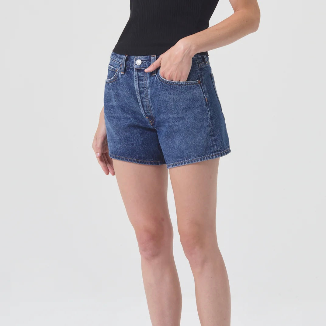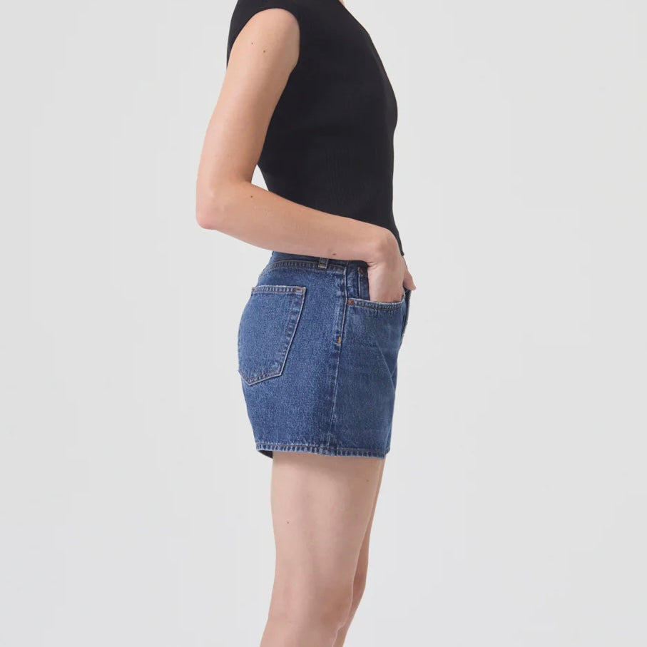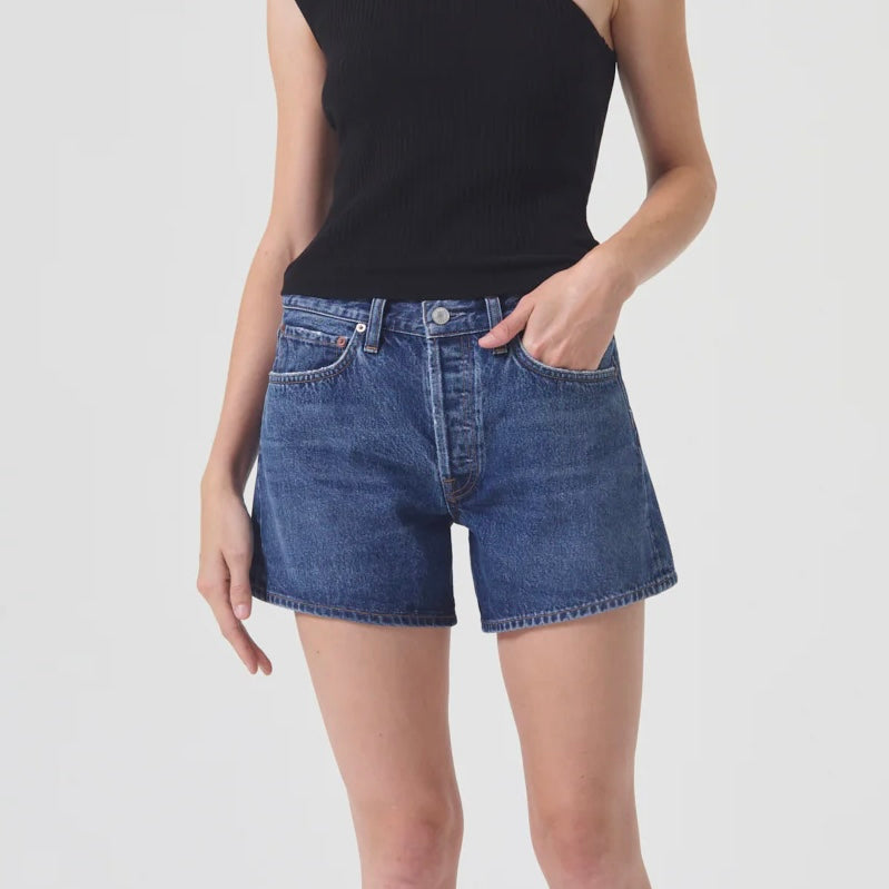 AGoldE Parker Long Short in Enamour. The Parker Long is an evolution of our iconic Parker Short, now designed with a slightly longer inseam for a more relaxed, easy fit. With its high-rise waist and just the right amount of room through the thighs, this silhouette offers laid-back comfort without losing its clean, timeless appeal. Rendered in a dark vintage indigo wash, it captures the depth and character of a true heritage denim short.