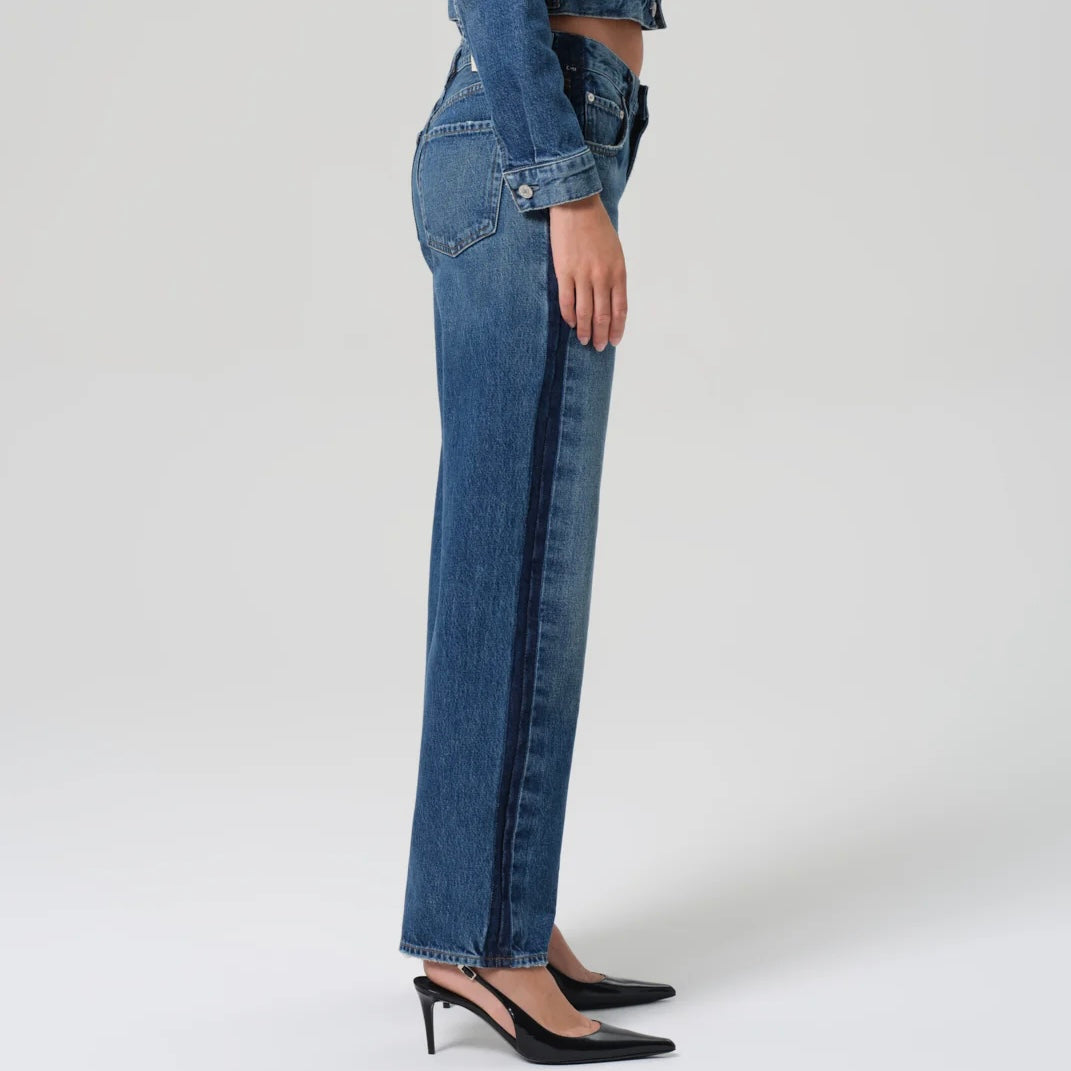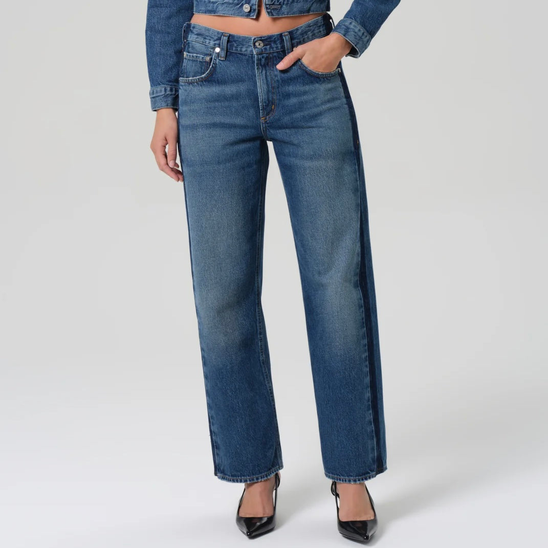 Citizens of Humanity Lindz Easy Straight Jean in Liro Tuxedo Stripe. The ‘Lindz’ is a relaxed straight leg with a low rise and an effortless attitude. Crafted from rigid regenerative cotton with a soft hand, it channels a subtly undone feel.