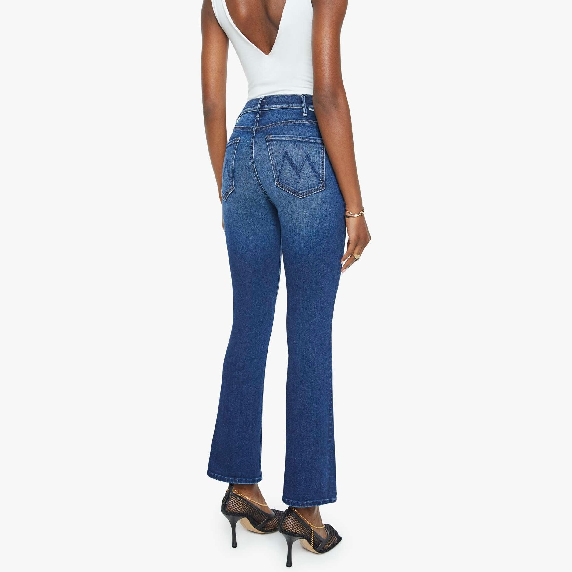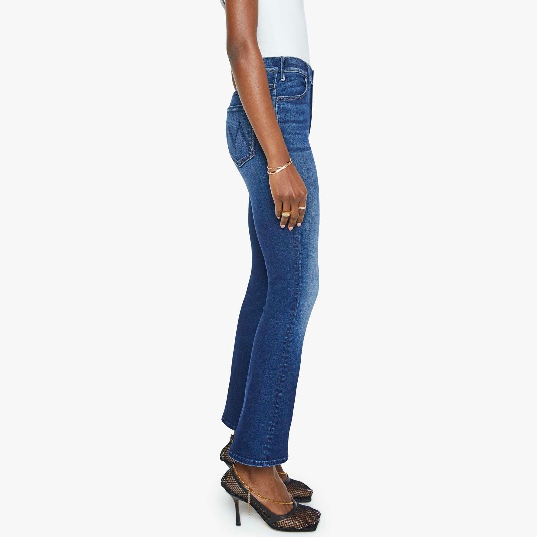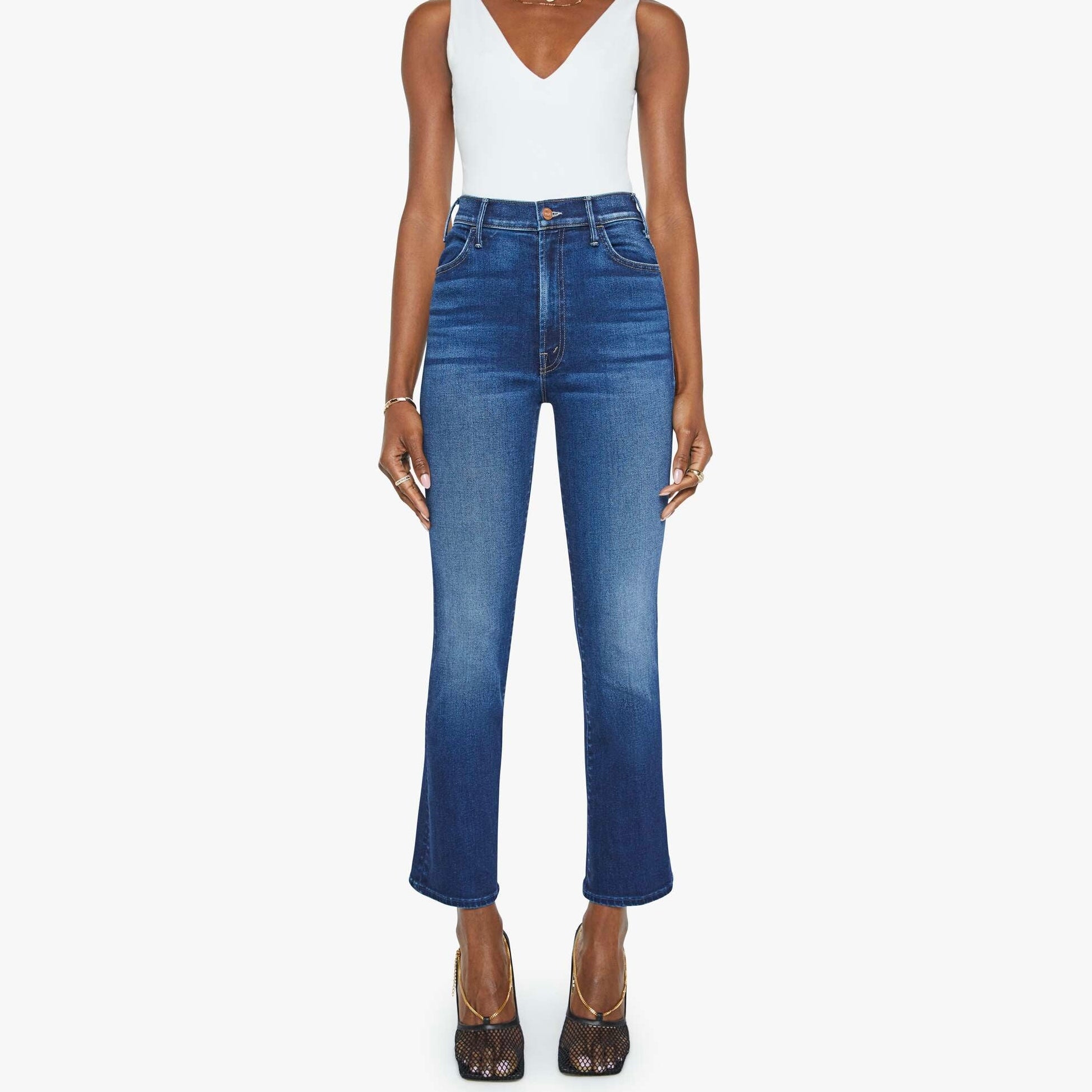Mother Hustler Ankle in Taking Chances. Roll the dice. This bestselling high-rise flare has an ankle-length inseam and a clean hem. Made from stretch denim, Taking Chances is a dark blue wash with whiskering and fading at the knees.