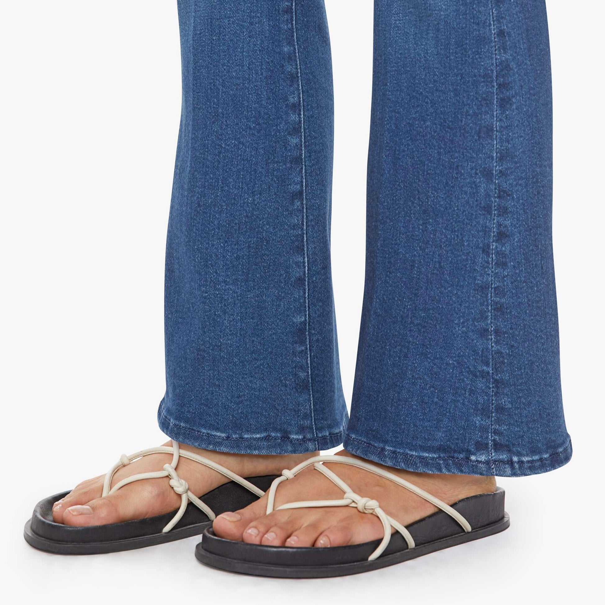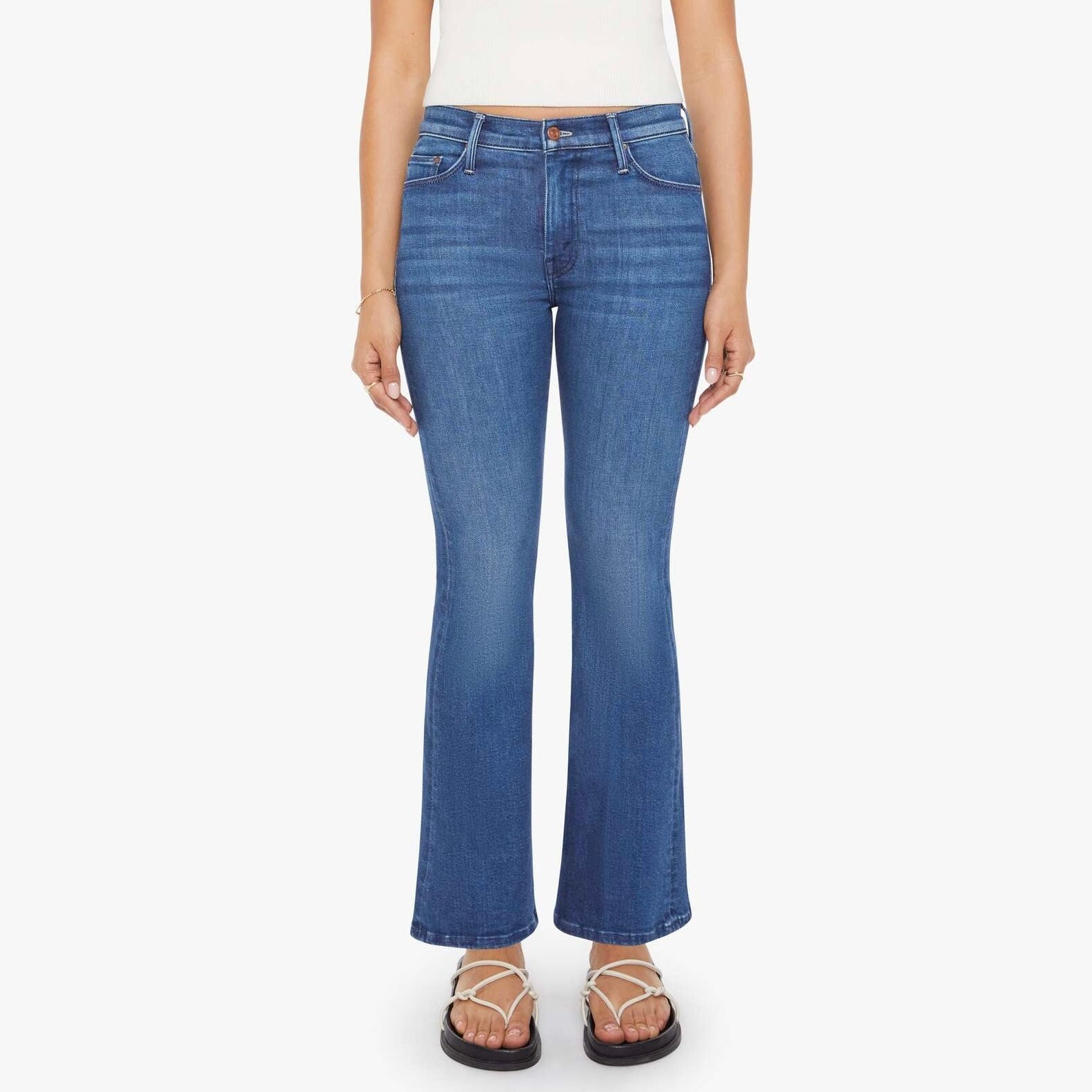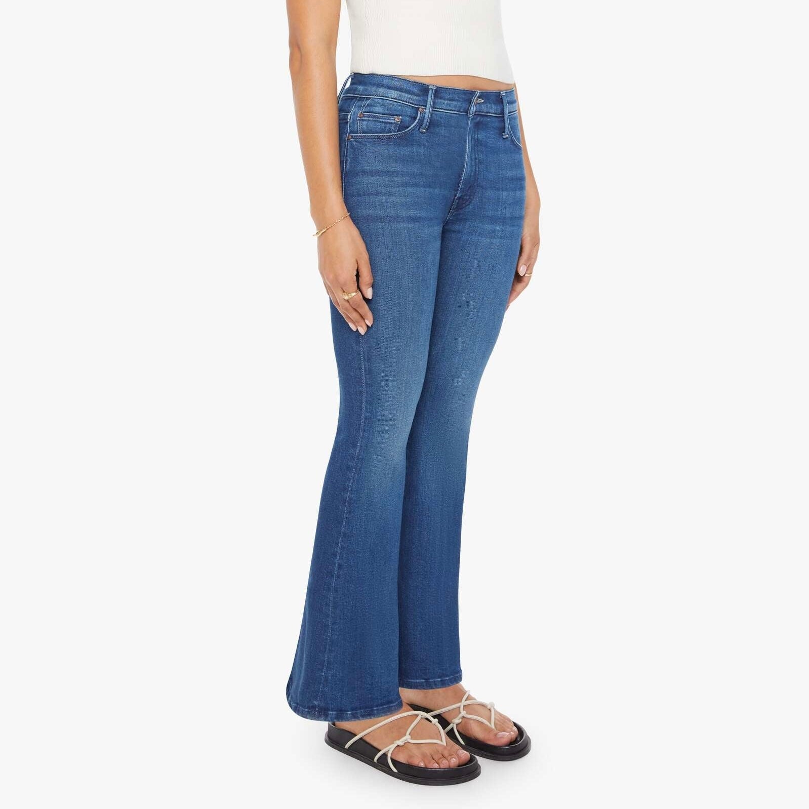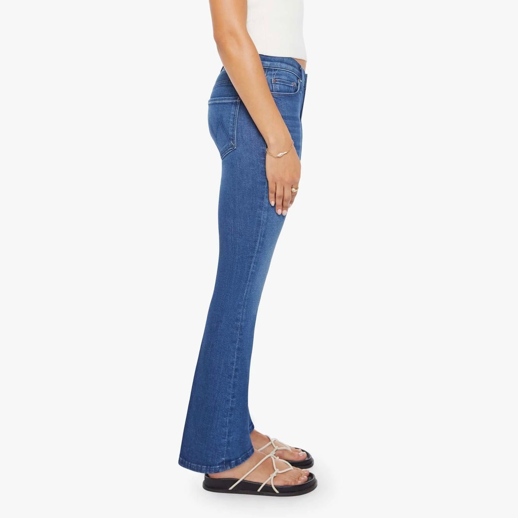 This cult-favorite flare jean has a mid rise, zip fly, sneaker-length inseam and a clean hem. Made from stretch denim, Nip It In The Butt is a mid-blue with whiskering and fading at the knees.
