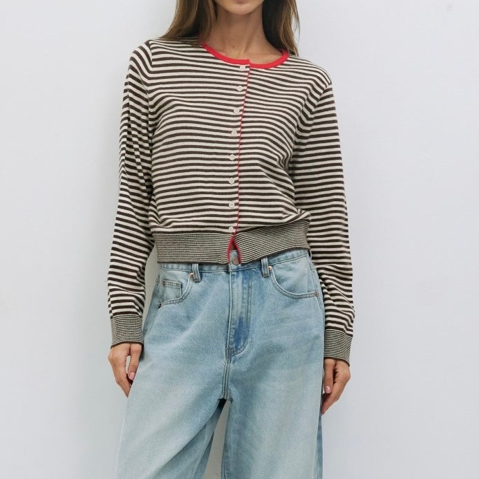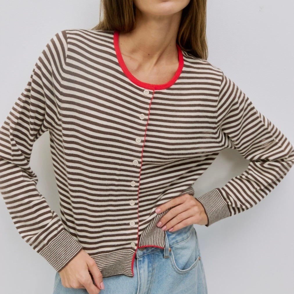 The Montana Cardigan is a lightweight, long-sleeve stripe knit cardigan with a relaxed fit, button-down closure, and a subtle front bottom slit.