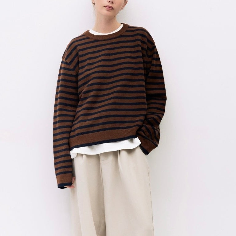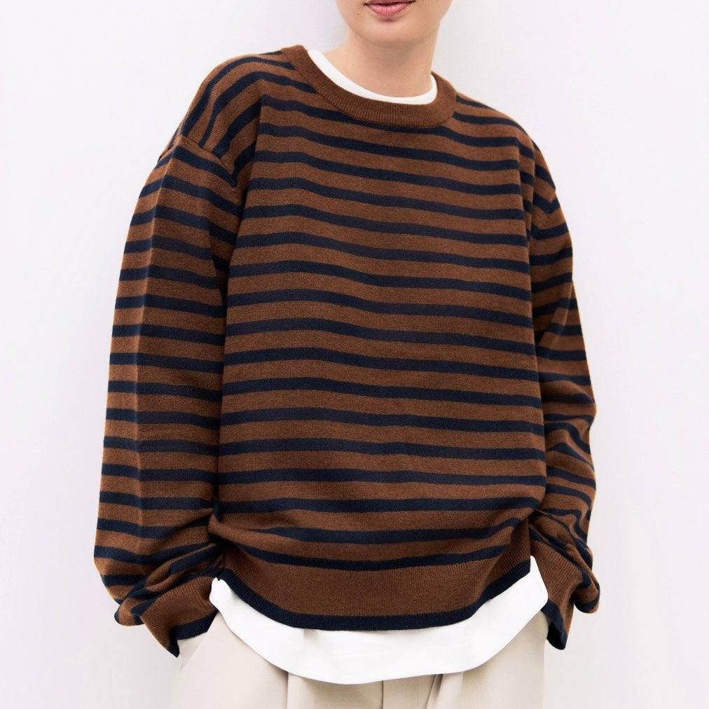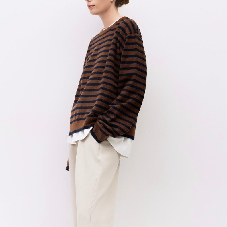 The Klein Sweater is a striped pullover sweater designed with a boyfriend fit for a laid-back, cozy look. The bell sleeves and crew neckline add a relaxed, yet polished touch to the mid-weight knit. Perfect for layering or wearing on its own for a casual day out.