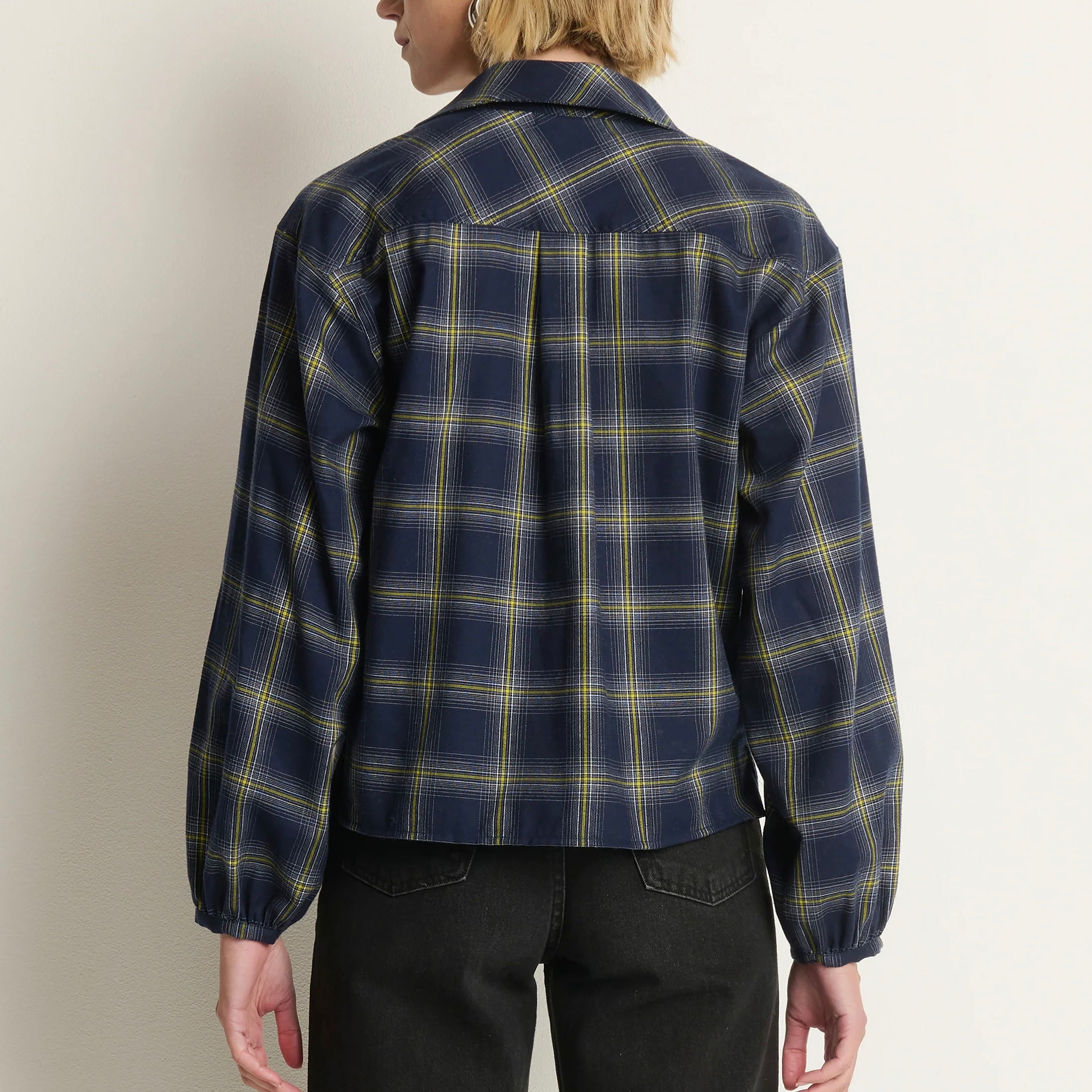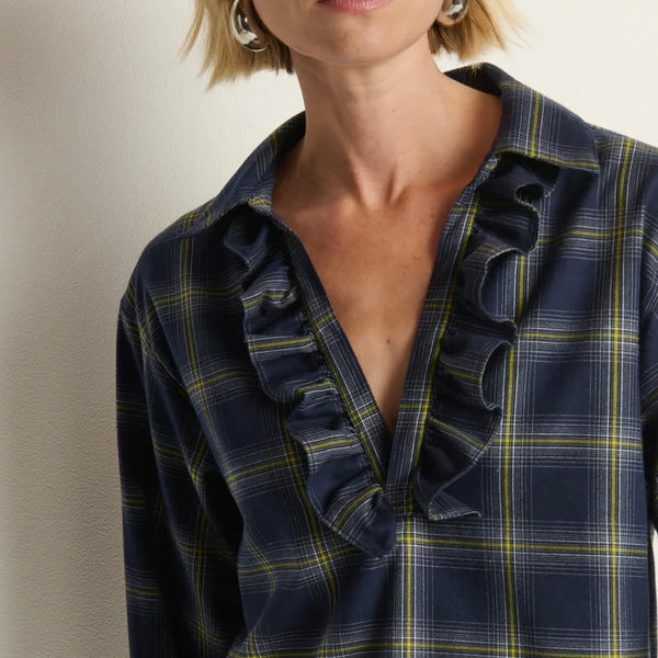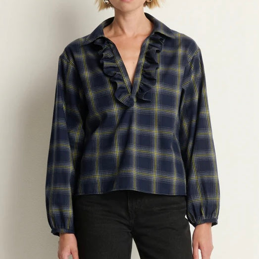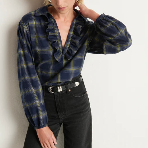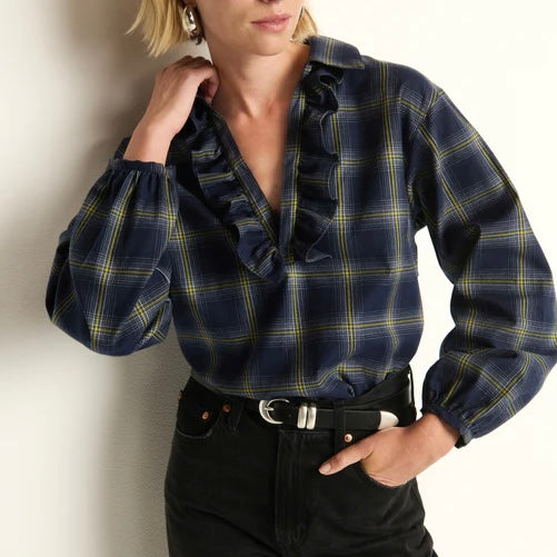 Nation Beckett Blouse in Starry Night Plaid. Flannel goes feminine—familiar and adored. The Beckett Blouse pairs casual comfort with subtle drama, crafted from 100% cotton sueded flannel in a relaxed fit, with a keyhole neckline and puff sleeves to bring softness.