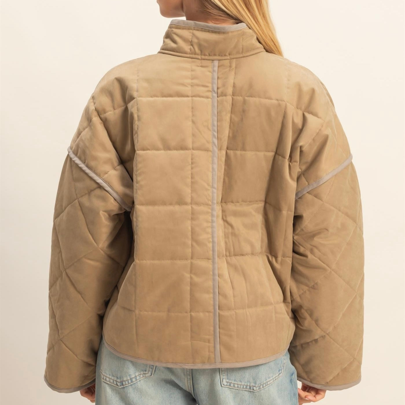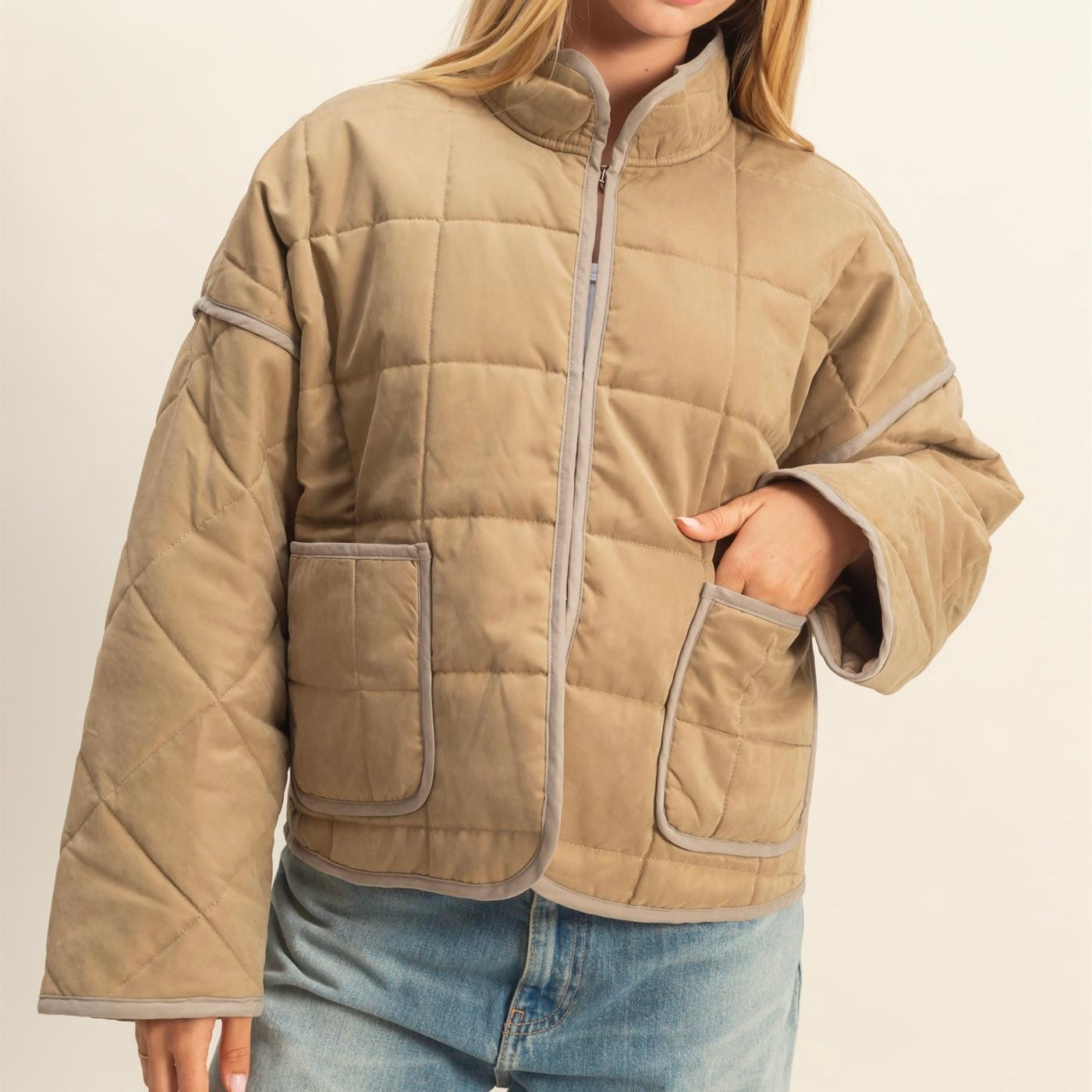 This quilted outerwear is designed with a structured fit and pocket detailing, offering both style and function. It features a smooth lining for comfort on cooler days. Ideal for layering, pair it with a lightweight turtleneck and tailored pants for a sophisticated, seasonal look.