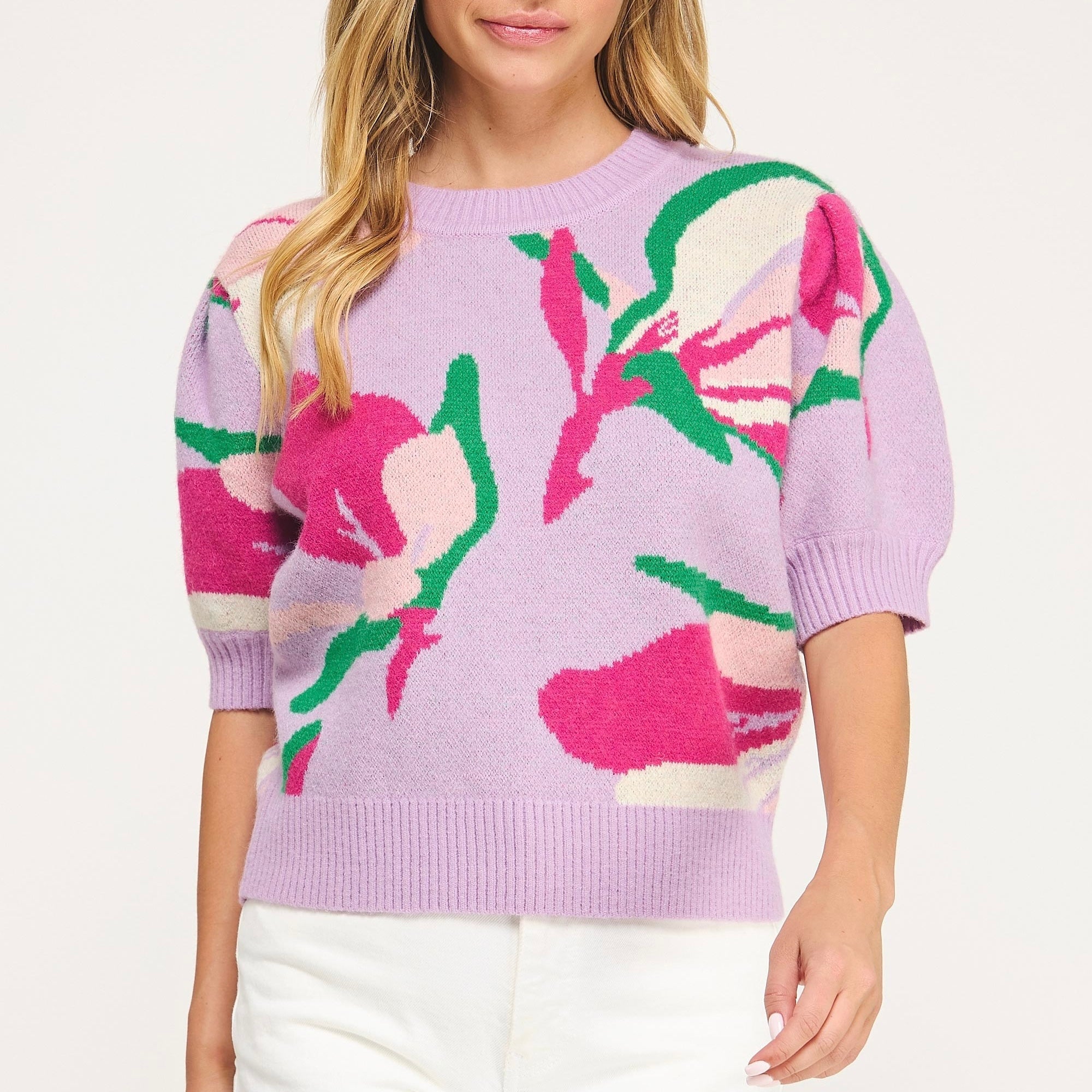 Floral patter short sleeve sweater top in knitted fabric. This knitted top features short puff sleeves, shirred shoulder, intarsia floral pattern, and ribbed round neck/cuff/hem.