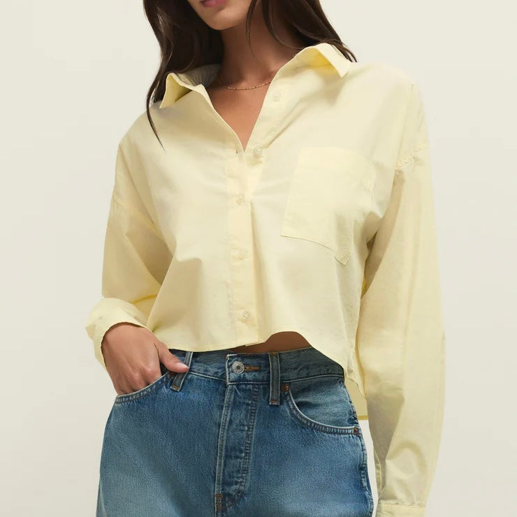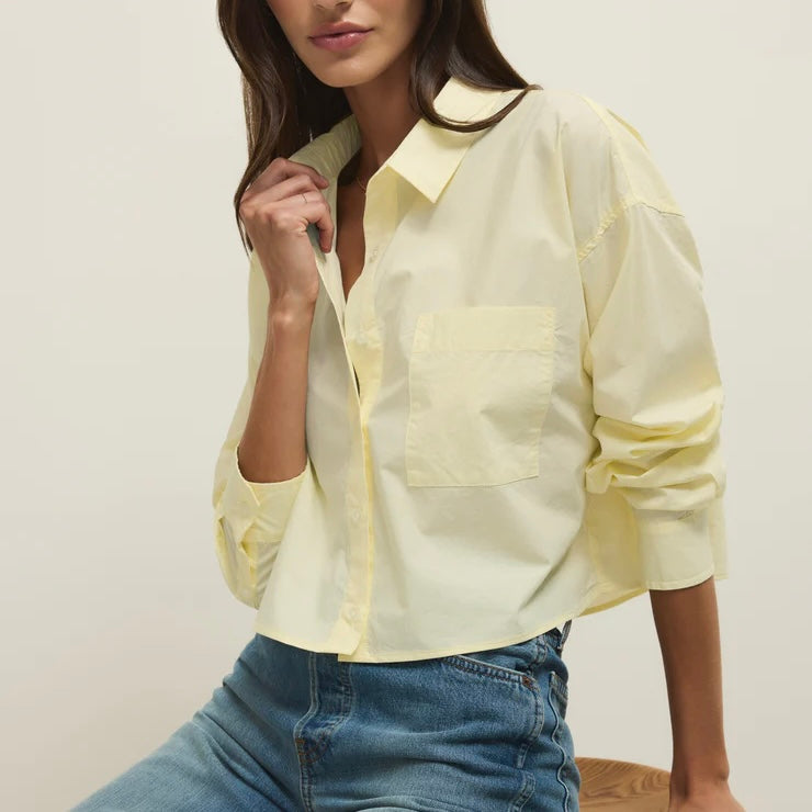ZSupply Lisette Top in Pineapple. Crisp and lightweight, this cotton poplin button-up instantly elevates any outfit. Designed with a meet-and-greet fit and straight hemline, it feels modern and easy to style with denim, skirts, or tailored pants for a refined everyday look.
