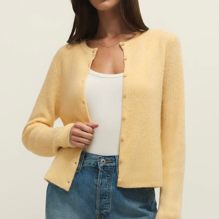 ZSupply Medina Rib Cardigan in Custard. This relaxed crewneck rib cardigan is made from cozy sweater yarns with an easy button-up front that’s perfect for layering. Whether tossed over a tank or worn solo, it’s the ideal go-to for cozy, casual days.