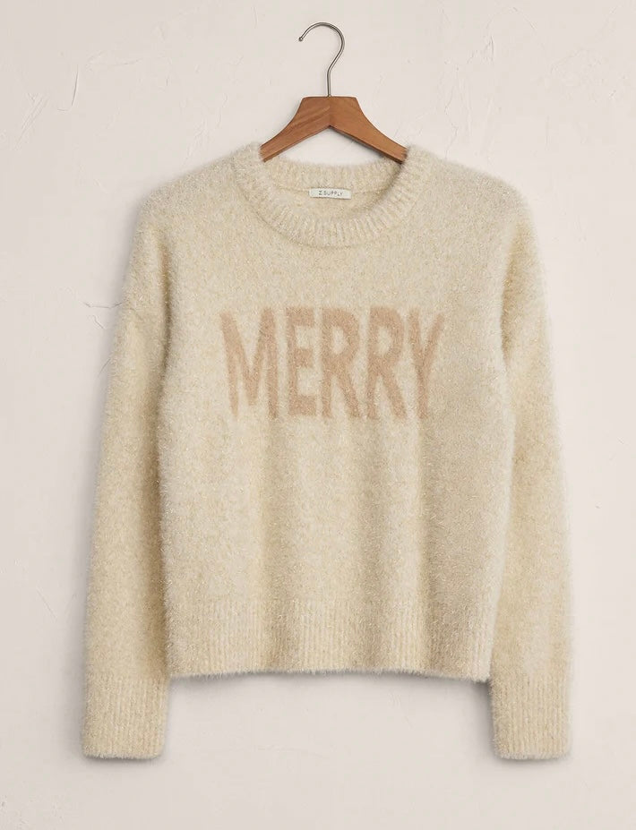 ZSupply Merry Gold Sweater. Shimmering metallic yarns elevate this cozy knit with a subtle holiday glow. The "Merry" intarsia detail makes it festive yet wearable beyond the season.