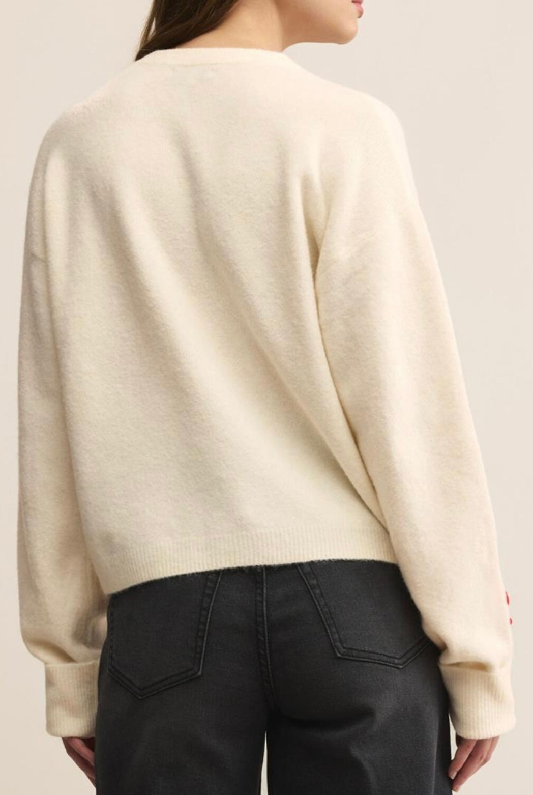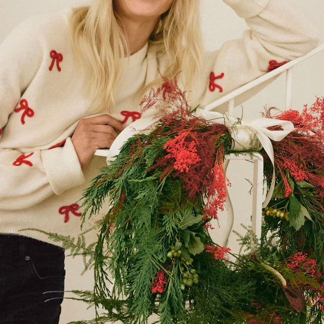 • Finished with delicate bow embroidery across soft yarns, its relaxed fit makes it the perfect festive layering piece.
