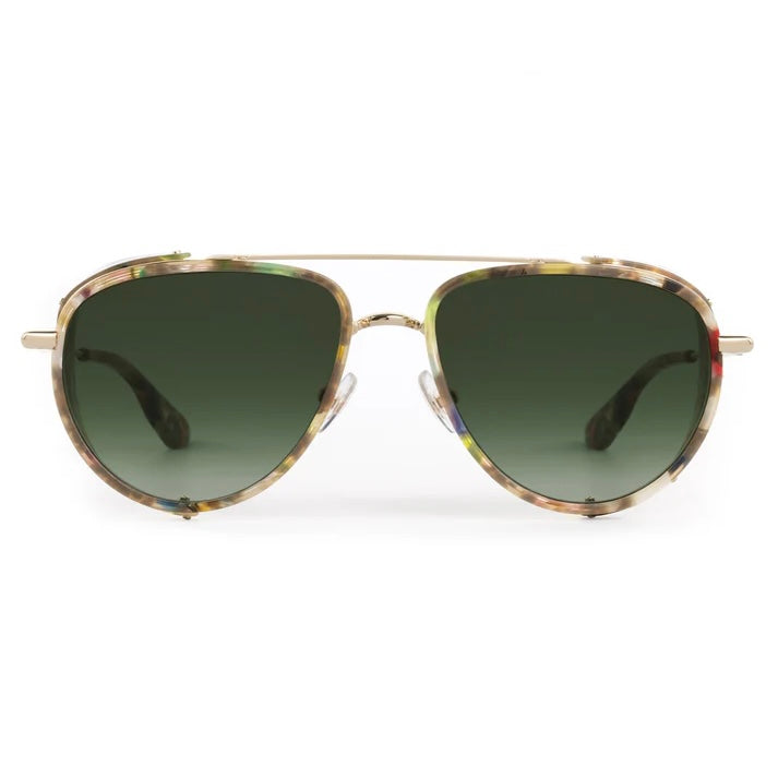Krewe Coleman Blinker in Mosaic 12K. For the adventure seekers. We reimagined COLEMAN—our classic aviator silhouette—with luxe, vintage-inspired blinker side shields. First introduced by Italian makers for alpine explorers and motorcyclists, this design accent is both functional and stylistic. Crafted from hand-mixed acetate and finished with our signature tapered temple wires, every detail of this slightly oversized frame is intentional.