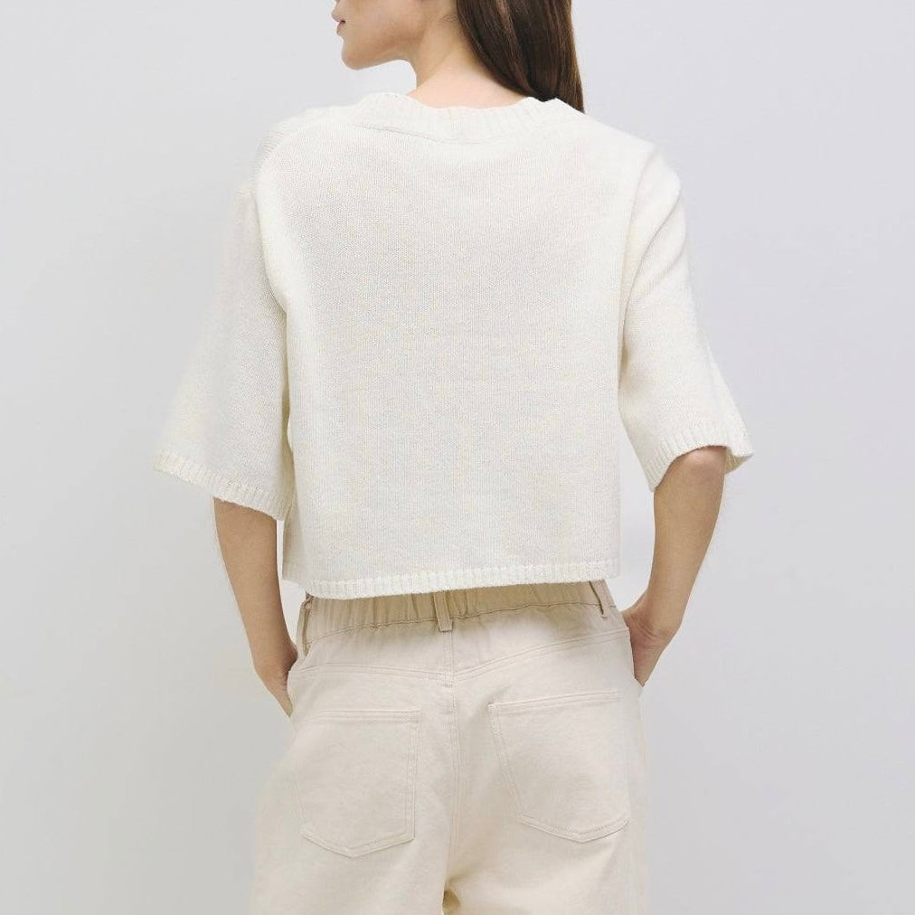 The Stacey Cardigan is a lightweight, half-sleeve cardigan with a relaxed fit, ideal for layering over tops and tanks. Features a wide neck, shell button closure, and ribbed trim.