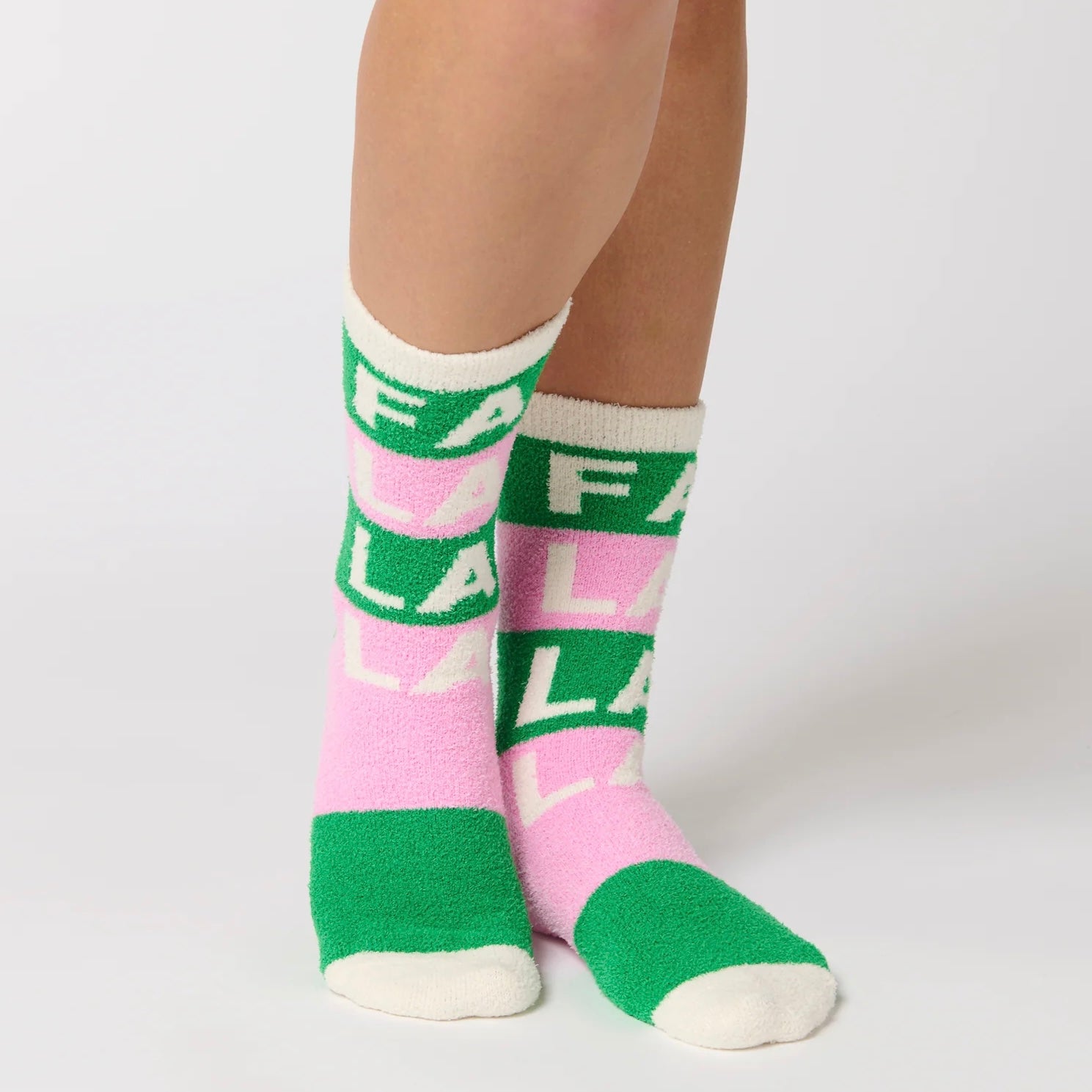 Sing it loud with the cutest socks of the season! The "Fa La La" Socks bring a festive pop of color with bold pink and green stripes and a playful holiday message stacked from top to toe. Made from super soft and cozy material, these socks are perfect for lounging, gifting, or dancing through December. The comfy, crew-length fit makes them a cheerful essential for chilly mornings and merry movie marathons.